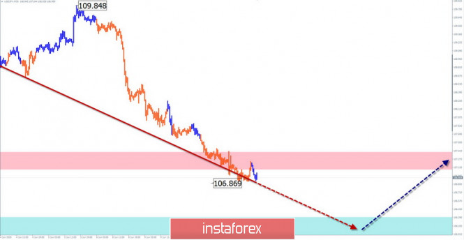 Упрощенный волновой анализ и прогноз EUR/USD и USD/JPY на 11 июняИнстаФорекс - Instaforex, 5 лет назад EUR/USD Анализ: Курс евро достиг сильной разворотной зоны крупного масштаба. Вдоль ее нижнего рубежа в последнюю неделю цена пары формировала плоскую коррекцию. В ее структуре недостает заключительной части (С). Прогноз: Сегодня ожидается преимущественно боковое движение инструмента, в ценовом коридоре между ближайшими зонами. К концу дня можно ждать завершения хода и начало подъема. При развороте не исключен кратковременный прокол нижней границы зоны поддержки Зоны потенциального разворота Сопротивление: - 1.1380/1.1410 Поддержка: - 1.1310/1.1280 Рекомендации: Торговля на рынке евровалюты до завершения всей коррекции может быть очень рискованна. Рекомендуется в районе поддержки отслеживать сигналы разворота, для поиска точек покупки пары. USD/JPY Анализ: В структуре восходящей волны японской иены от 9 марта близится к завершению средняя часть (В). Ее последний участок от 5 июня завершает образовавшуюся горизонтальную плоскость. Прогноз: Сегодня наиболее вероятным сценарием движения будет продолжение хода вниз. Целью может быть верхняя граница крупной потенциальной зоны разворота. На ближайшей сессии возможен кратковременный ценовой подъем. Зоны потенциального разворота Сопротивление: - 107.10/107.40 Поддержка: - 106.30/106.00 Рекомендации: Для покупок на рынке пары сегодня нет условий. Рекомендуется отслеживать все возникающие сигналы продажи инструмента. Пояснения: В упрощенном волновом анализе (УВА) волны состоят из 3 частей (А-В-С). Анализируется последняя незавершенная волна. Сплошным фоном стрелок показана сформированная структура, пунктирным - ожидаемые движения. Внимание: Волновой алгоритм не учитывает продолжительность движений инструмента по времени! Материал предоставлен компанией InstaForex - www.instaforex.com |