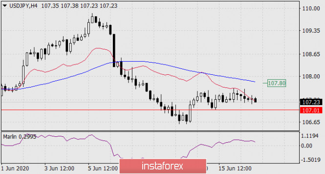 На четырёхчасовом графике цена ниже индикаторных линий баланса и Крузенштерна. Осциллятор Марлин разворачивается вниз, к границе с отрицательной тенденции сигнальная линия подойдёт как раз к моменту атаки цены на ключевой уровень 107.01 (минимум 15 июня).