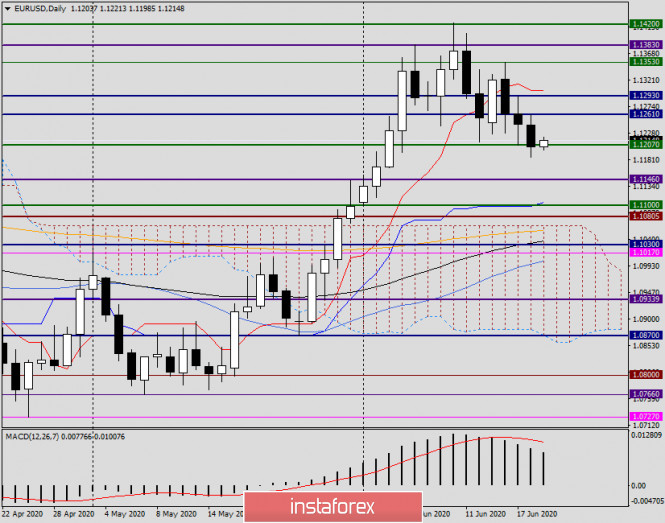 Анализ и прогноз EUR/USD на 19 июня 2020 годаИнстаФорекс - Instaforex, 5 лет назад Здравствуйте, уважаемые коллеги! Если подводить промежуточные итоги текущих недельных торгов по главной валютной паре рынка Forex, то, как и предполагалось в начале текущей пятидневки, EUR/USD продолжила нисходящее движение. Влияние на умы инвесторов оказывают опасения второй волны COVID-19, а также улучшающиеся макроэкономические данные из США, которые показывают восстановление ведущей мировой экономики после весенней пандемии коронавируса. Конечно, о полной победе над COVID-19 говорить ещё слишком рано, но признаки экономического восстановления в США очевидны. Так, вчера стало известно, что количество американцев, которые обратились за заявками на пособие по безработице, хоть и вышло хуже ожиданий, но улучшилось по сравнению с прошлым показателем 1566 (пересмотрено с 1542) и составило 1508. В Европе продолжается процесс согласования пакета стимулирующих мер, преложенного Еврокомиссией. Здесь, как говорится, единства нет. Дебаты продолжаются. Ряд стран высказывается против предоставления грантов помощи наиболее пострадавшим от пандемии государствам ЕС. Заглянув в сегодняшний экономический календарь, можно выделить данные из США по сальдо торгового баланса, а также речи высокопоставленных монетарных чиновников Федеральной Резервной Системы (ФРС) США, среди которых стоит выделить выступление главы ведомства Джерома Пауэлла, которое запланировано на 20:00 (мск). Daily Переходя к технической картине евро/доллара, стоит отметить, что значимый технический уровень 1.1200 вновь устоял, и торги четверга завершились на 1.1204. В последний день текущих торгов возможна корректировка позиций. Весьма вероятно, что инвесторы начнут перед выходными фиксировать позиции и пара немного подрастёт. Если так и произойдёт, ближайшими целями евробыков станут вчерашние максимумы на 1.1261, а выше максимумы 17 июня на 1.1293 и линия Тенкан индикатора Ишимоку, которая проходит на 1.1303. Закрытие дневных и недельных торгов выше 1.1300 даст надежду на последующее укрепление главной валютной пары. Если день и неделя завершатся под ещё одной весьма важной отметкой, 1.1200, на следующей неделе стоит ожидать продолжение нисходящего сценария. Н1 На часовом графике пара торгуется в нисходящем канале с параметрами: 1.1353-1.1258 (линия сопротивления) и 1.1227 (линия поддержки). На момент написания торги проходят в непосредственной близости от линии сопротивления данного канала. Пара демонстрирует умеренный рост, и, скорее всего, состоится попытка пробоя верхней границы канала. В этом случае ситуация для быков по eur/usd усложняется нахождением над линией сопротивления канала используемых скользящих средних: 50 МА, 89 ЕМА и 200 ЕМА. Могу предположить, что пробой верхней границы нисходящего канала окажется ложным, и от одной из скользящих средних пара развернётся на снижение. Торговые рекомендации по EUR/USD Учитывая возросший спрос на американскую валюту и техническую картину на старших таймфреймах (недельный рассмотрим в понедельник), считаю основной торговой идеей продажи, которые можно пробовать открывать на попытках выхода вверх из часового нисходящего канала, от скользящих средних. Предлагаю рассматривать открытие коротких позиций от 1.1230, 1.1245 и 1.1255. Более агрессивно и рискованно можно продать с текущих цен 1.1215, но риск нарваться