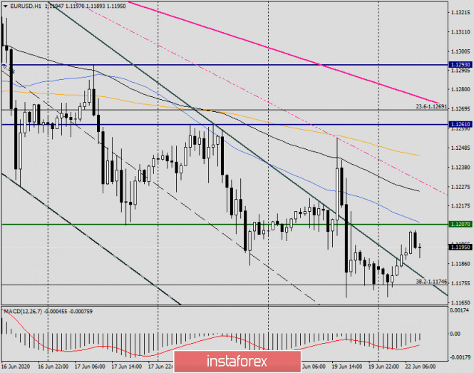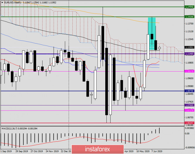 Обзор и прогноз по EUR/USD на 22 июня 2020 годаИнстаФорекс - Instaforex, 5 лет назад Имеем то, что имеем Доброго времени суток, уважаемые коллеги! На прошлой неделе доллар США пребывал в роли безоговорочного фаворита на рынке Forex. Американская валюта укрепилась по отношению ко всем основным конкурентам, за исключением японской иены. В частности, главная валютная пара EUR/USD потеряла на торгах 15-19 июня 0.60%. Доллар США получил дополнительный спрос на фоне опасений второй волны COVID-19. Как мы помним, во время первой волны пандемии коронавируса именно «американец» был востребован участниками рынка как безопасный актив. Кстати, в своих записках клиентам большинство аналитических отделов крупнейших мировых коммерческих банков пророчат укрепление доллара США, как минимум в среднесрочной перспективе. Вполне возможный сценарий, но не стал бы делать столь далеко идущих прогнозов. Ситуация может измениться в любой момент, и курс американской валюты зависит от многих факторов, как то дальнейшие шаги в денежно-кредитной политике Федеральной Резервной Системы (ФРС) США. Вполне вероятно, что в ближайшее время Федрезерв примет решение сочетать доходность казначейских гособлигаций США с уровнем инфляции. Такое сочетание поможет снизить потенциальные риски, связанные с новой вспышкой COVID-19. А вот как это может отразиться на курсе доллара США, вопрос пока открытый. Если заглянуть в экономический календарь, то на этой неделе участникам рынка предстоит переварить большой поток макроэкономической статистики. По большей части, она будет поступать из США, и среди прочего можно выделить окончательные данные по ВВП за первый квартал, заказы на товары длительного пользования, личные расходы и доходы американцев, а также индекс деловой активности в производственном секторе и секторе услуг. Из европейской статистики стоит обратить внимание лишь на аналогичные индексы. Сегодня не ожидается большого потока макроэкономической информации, разве что инвесторов могут заинтересовать данные из США по продажам жилья на вторичном рынке, которые будут опубликованы в 17:00 (мск). Weekly Переходя к техническому анализу главной валютной пары рынка Forex, начнём с итогов завершившейся недели, а именно с рассмотрения соответствующего временного промежутка. Как предполагалось в прошлый понедельник, выделенная свеча, выполненная в виде модели «Падающая звезда», скорее всего, послужит сигналом для дальнейшего снижения котировки. По итогам торгов прошлой пятидневки данное предположение оправдалось, как и тот факт, что евробыки не сдадутся без боя и предпримут попытки возобновить подъём курса. Подтверждением этому является длинная верхняя тень последней свечи. А теперь по факту самого закрытия недели. Во-первых, закрылись в пределах облака индикатора Ишимоку, что само по себе подразумевает закрепление в его пределах с последующим потенциалом снижения к нижней границе облака, которая проходит на 1.1107. Во-вторых, неделя закрылась под важнейшим уровнем 1.1200, который долгое время выполнял функцию поддержки и препятствовал дальнейшему снижению. В предыдущем пятничном обзоре по eur/usd подчёркивалось, что закрытие недели выше 1.1300 укажет на возвращение крупных покупателей, а завершение торговой пятидневки под 1.1200 ещё сильнее обозначит дальнейшие медвежьи перспективы инструмента. Имеем 