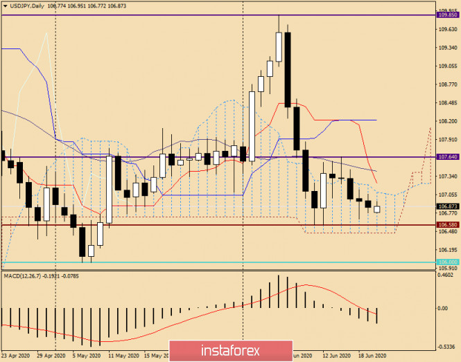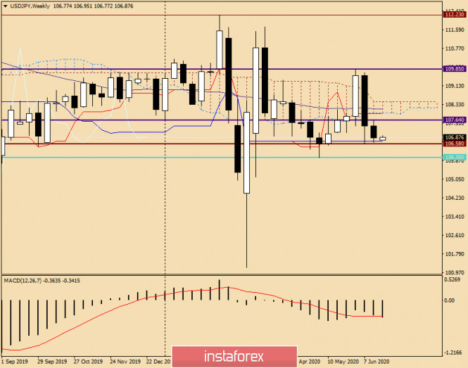 Анализ и прогноз по USD/JPY на 22 июня 2020 годаИнстаФорекс - Instaforex, 5 лет назад Здравствуйте! На прошлой неделе японская иена стала единственной из всех основных валют, которые укрепились по отношению к доллару США. Надо признать, что данная пара ходит своей собственной дорогой, не оглядываясь на остальных. А именно, в последнее время, когда все другие основные валюты укрепляются к USD, иена снижается и наоборот. Вообще, по данной валютной паре наблюдается интересная ситуация. И японская иена, и американский доллар воспринимаются участниками рынка как валюты-убежища. Однако во время первой вспышки пандемии COVID-19 безоговорочный приоритет инвесторы отдавали доллару США. Сейчас же, когда существует опасность второй волны нового типа коронавирусной инфекции, участники рынка, похоже, отдают предпочтение иене как традиционному защитному активу. Если заглянуть в экономический календарь, то на этой неделе ожидается достаточно большой поток макроэкономических данных, в основном из США. Из наиболее важной американской статистики стоит выделить окончательные данные по ВВП за первый квартал, которые будут опубликованы 25 июня в 15:30 (мск). Из японской статистики на этой неделе можно отметить индекс деловой активности в секторе услуг и в производственном секторе. Ещё раз хотел бы напомнить и обратить внимание, что данная валютная пара, как правило, сильно реагирует на важные макроэкономические отчёты из США, в то время как японская статистика в основном остаётся незамеченной. Weekly Ну что же, пора переходить к рассмотрению графиков валютной пары USD/JPY, и начнём с итогов завершившейся недели. Итак, на торгах минувшей пятидневки пара продолжила нисходящую динамику, которая началась после достижения отметки 109.85, то есть непосредственно перед встречей с важнейшим техническим и психологическим уровнем 110.00. Пара закрепилась под облаком индикатора Ишимоку, однако снижение носило достаточно сдержанный характер, так как линия Киджун данного индикатора продолжила оказывать сильную поддержку и не пустила пару ниже. Пока не пустила. Всё это хорошо видно на недельном графике. Теперь о перспективах ценового движения на эту неделю. Наиболее актуальным, по моему личному мнению, является продолжение нисходящего сценария. Однако для этого необходимо пробить Киджун (106.71), а также уровень поддержки 106.58. Это будет важной задачей для игроков на понижение курса, но главным, на мой взгляд, станет пробой очень важного и сильного уровня 106.00. Только закрепление под этой отметкой окончательно убедит в превосходстве продавцов и откроет дорогу к более низким ценам. Для возвращения бычьих настроений по usd/jpy нужно поднимать курс выше предыдущих максимумов 107.64, после чего пробивать линию Тенкан (107.92), входить в облако Ишимоку, пробивать 50 простую скользящую среднюю и выводить цену вверх из облака. Надо признать, что задачи у противоборствующих сторон не из простых. Возможно, для их решения понадобится сильный драйвер. Daily Если перейти на дневной график, то видим, что котировка уже закрепилась в пределах облака Ишимоку. Теперь стоит ждать выхода цены в одну из сторон, что и укажет на дальнейшее направление валюты. Рискну предположить, что попытки выхода из облака вверх постарается сдержать линия Тенкан, которая проходит на 107.23, а выше 50 МА(107.42). Нижняя граница облака пролегае