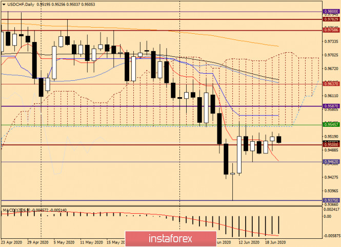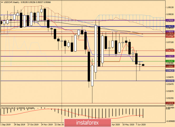 Анализ и прогноз по USD/CHF от 22 июня 2020 годаИнстаФорекс - Instaforex, 5 лет назад Приветствую уважаемых коллег! Валютная пара доллар/франк не так уж часто попадает в объективы нашего внимания. Что же, будем восполнять этот пробел, так как пара достаточно интересная и является одной из основных на валютном рынке Forex. Для начала хотел бы напомнить, что на прошлой неделе, 18 июня, Швейцарский Национальный Банк (ШНБ) провёл своё плановое заседание, по итогам которого было принято решение не вносить изменений в денежно-кредитную политику и оставить ключевую процентную ставку на прежнем уровне минус 0.75%. Данное решение ШНБ полностью оправдало ожидания участников рынка, поэтому особо бурной реакции на это событие не наблюдалось. Напомню, что пара USD/CHF интересна тем, что и доллар США и швейцарский франк воспринимаются участниками рынка как безопасные активы, или как валюты-убежища. При этом укрепление одной или другой валют происходит исходя из соответствующих событий и трактуется по-разному. Для примера можно привести факт, что во время разгара пандемии COVID-19 именно американский доллар, а не швейцарская валюта, был востребован как защитный актив. На мой взгляд, такой фактор имел место в силу угроз коронавируса для глобальной мировой экономики. Во время геополитических обострений, стихийных бедствий и тому подобных негативных проявлениях, большую востребованность, как правило, приобретает уже франк. Weekly По итогам прошлой недели курс пары доллар/франк практически не изменился. «Свисси» окреп по отношению к «американцу» всего лишь на 0.02%. В основном торги велись вокруг значимого психологического и технического уровня 0.9500, и в итоге завершились выше этой отметки, на 0.9518. Таким образом, после предыдущей медвежьей свечи с очень длинной нижней тенью, на прошлой неделе появилась свеча без тела - натуральная модель «Дожи». Однако стоит обратить внимание, что у последней свечи более длинная нижняя тень, что указывает на больше усилий, которые пришлось приложить игрокам на повышение курса. Ну и цена закрытия выше 0.9500 также больше способствует ожиданиям укрепления котировки. Впрочем, в силу специфики данной валютной пары отнюдь не всё так просто и однозначно. Сильное сопротивление оказывает линия Киджун индикатора Ишимоку, расположенная на 0.9541. Только пробой этой линии и закрытие недельных торгов выше Киджун просигнализирует о дальнейшей готовности пары двигаться в северном направлении. Поддержка представлена минимальными значениями прошлых торгов 0.9462. Если этот уровень будет пробит и торги текущей пятидневки закроются под ним, следующей целью станет отметка 0.9375, где были показаны минимумы позапрошлых недельных торгов. Daily На дневном графике пара более чем уверенно закрепилась под нижней границей облака индикатора Ишимоку и начала консолидироваться. Как правило, после таких консолидаций происходит направленное движение в одну из сторон. Сегодняшние торги usd/chf начала умеренным снижением. В случае его продолжения, пара рискует опуститься в район 0.9463, где проходит линия Тенкан и горизонтальный уровень поддержки. Если здесь появятся бычьи разворотные свечные модели, это станет сигналом к покупкам доллар/франка. В случае разворота вверх с текущих значений (0.9505), пара, скорее всего, направится в район 0.9540-0.9550. Если в обозначенном районе появятся м