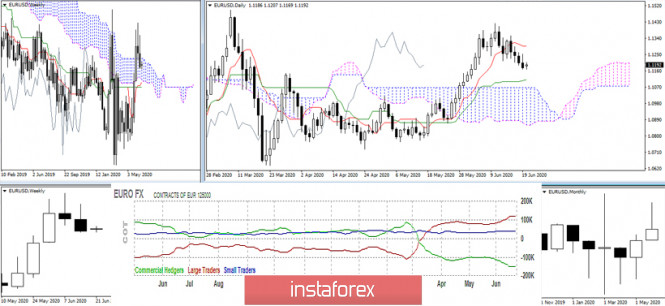 Последний отчет СОТ (Commitments of Traders). Недельные перспективы для EUR/USDИнстаФорекс - Instaforex, 5 лет назад Последний отчет СОТ (Commitments of Traders). Недельные перспективы для EUR/USD По данным последнего отчета СОТ (Commitments of Traders от 16.06.20), открытый интерес к евро снизился (574,939 против 592,915). Нужно отметить, что итоговые позиции крупных игроков получили снижение по обоим направлениям (long -12,946 и short -13,113), но при этом участники рынка, именуемые Non-Commercial, активнее продолжали, как и в прошлый раз, избавляться от коротких позиций (-19,032), а вот группа Commercials делала упор на ликвидацию длинных позиций (-14,109). Доминирование закрытых позиций также характерно и для статистики от крупнейших дилеров и брокеров (Dealer Intermediary), которые хоть и вновь увеличили процентный разрыв позиций (58,4 против 4,5), но сделали это, в отличие от прошлого раза, не за счет наращивания количества контрактов по обоим направлениям, а за счет резкого сокращения и закрытия позиций одного из направлений. Поэтому в ближайшее время процентное предпочтение в данной группе скорей всего начнёт изменять структуру. Основной вывод Преобладание в отчете массового закрытия позиций говорит о том, что пришло время зафиксировать результат. Действующая тенденция нуждается в пересмотре и в ней возможны изменения. Техническая картина За последнюю рабочую неделю нисходящая коррекция получила развитие. Дневное формирующееся облако перестало расширяться, заняв горизонтальное расположение. Поддержка дневной краткосрочной тенденции работает на стороне игроков на понижение, располагаясь на 1,1295 в виде сопротивления. На неделях медведи сумели достичь неплохого результата, вернувшись в недельное облако (Сенкоу Спан Б 1,1225) и обозначив из комбинации трёх последних недельных свечей разворотную тенденцию глубокого снижения, которая способна повлиять на дальнейшие трендовые предпочтения. Началась последняя декада месяца, поэтому внимание сейчас будет направлено на формирование итогового месячного результата. Для игроков на повышение на предстоящую неделю основные ориентиры и задачи сводятся к тому, чтобы вновь выйти в бычью зону относительно недельного облака (1,1225), вернуть себе поддержку дневного краткосрочного тренда (1,1295), с дальнейшей перспективой обновления двух важных максимальных экстремумов (1,1422 и 1,1496). Для игроков на понижение в ближайшее время важно превратить текущую дневную коррекцию в начало смены дневного тренда, для этой цели возможен ретест пройденного дневного Тенкана (1,1295), без обновления максимума коррекции (1,1422), и продолжение снижения, основное значение при котором будет иметь результат тестирования важной зоны поддержек 1,1065 – 1,1110 (дневное облако + дневной Киджун + недельный золотой крест Ишимоку + нижняя граница недельного облака + месячный Тенкан). Ключевые сопротивления младших временных интервалов сегодня находятся на 1,1199 (центральный Пивот-уровень) и 1,1246 (недельная долгосрочная тенденция). Закрепление выше повлияет на действующий баланс сил младших таймов, отдав предпочтение восстановлению позиций игроками на повышение. Выход из зоны коррекции Н1 и обновление минимума прошлой недели (1,1168) вернёт актуальность поддержкам классических Пивот-уровней, которые сегодня находятся на 1,1145 – 1,1115 – 1,1061. Ichimoku Kinko Hyo (9.26.52), Pivot Points (классические), Moving Avarage (120) Материал предоставлен компанией InstaForex