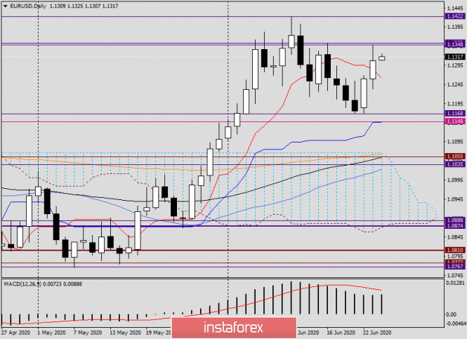Анализ и прогноз по EUR/USD на 24 июня 2020 годаИнстаФорекс - Instaforex, 5 лет назад Здравствуйте, уважаемые коллеги! С информационных полос средств массовой информации (СМИ) в последние дни не сходит Китай. То, что у них напряжённые отношения с Соединёнными Штатами Америки, всем хорошо известно, и в первую очередь это касается торговых взаимоотношений. Появились сообщения о том, что торговая сделка между США и Китаем будет расторгнута, однако президент США Дональд Трамп в присущей ему манере в своём Твиттере дал опровержение этим слухам. Трамп надеется, что китайская сторона не откажется от выполнения всех условий соглашения. Напомню, что отношения между Соединёнными Штатами и Китаем обострились после того, как американский лидер обвинил КНР в распространении COVID-19, а также после темы Гонконга. В Евросоюзе, в свою очередь, также обеспокоены торговыми отношениями с Поднебесной и хотят, чтобы Пекин предоставил европейским компаниям равные и справедливые условия для работы в КНР. Daily А между тем на валютном рынке главная пара EUR/USD вчера продолжила восходящую динамику и завершила торги вторника на уровне 1.1307, что весьма символично для перспектив продолжения роста. Также стоит отметить, что в результате укрепления котировка уверенно преодолела линию Тенкан индикатора Ишимоку. Сегодня с утра главная валютная пара рынка Forex пока торгуется без чётко выраженной направленности, незначительно укрепляясь. Если предыдущий двухдневный рост будет продолжен, целями евробыков станут уровни сопротивления 1.1353 и 1.1422. При этом преодоление последней отметки откроет дорогу к важному психологическому и техническому уровню 1.1500, прямо под которым были показаны максимальные значения торгов 9 марта этого года. А вот у медведей по eur/usd задача теперь усложнилась. Для того чтобы взять торги по паре под свой контроль, игрокам на понижение необходимо возвращать цену под линию Тенкан, после чего пробивать поддержки на 1.1168 и 1.1148, где находится линия Киджун индикатора Ишимоку. Судя по настроениям участников рынка и технической картине на дневном таймфрейме, больше шансов на то, что рост будет продолжен. Впрочем, необходимо учитывать сегодняшние события. Это индексы от IFO по текущим условиям, ожиданиям и деловому климату в Германии. Данный блок статистики будет опубликован в 11:00 (мск). Из США сегодня статистики не ожидается, зато свои речи произнесут члены Комитета по открытым рынкам Эванс и Буллард в 19:30 (мск) и в 22:00 (мск) соответственно. Н1 На часовом графике хорошо видно, что пара со второй попытки, но всё же пробила красную линию сопротивления 1.1422-1.1353. После техничного отката к пробитой линии рост продолжился и достиг уровня 1.1348, откуда состоялся вполне естественный и ожидаемый откат к знаковой отметке 1.1300. На момент завершения данной статьи пара демонстрирует укрепление и просто горит желанием его продолжить. Если желания совпадут с возможностями, ближайшей целью быков по евро станет сильная ценовая зона сопротивления 1.1348-1.1353. Для достижения более высоких целей необходим истинный пробой отметки 1.1353 с обязательным закреплением над этим уровнем. Если растянуть сетку инструмента Фибоначчи на рост 1.1168-1.1348, то видим, что пара уже давала откат к первому уровню 23.6 от этого движения, после чего разворачивается вверх, показывая готовность продолжить движение в северно