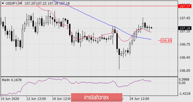 Осциллятор Марлин из зоны понижающейся тенденции выходить не спешит, что в итоге может обратиться в ложность выхода цены вверх. Целевой уровень роста 107.77.
