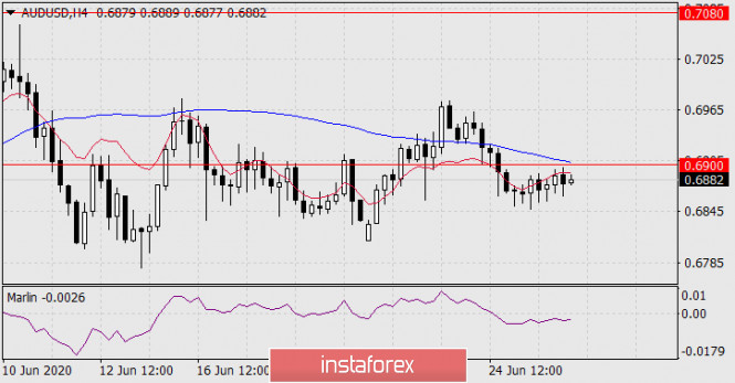 На четырёхчасовом графике цена продолжает развиваться под красной индикаторной линией баланса, Марлин развивается в нисходящей тенденции. Ждём дальнейшего снижения «австралийца» к целевому уровню 0.6680.