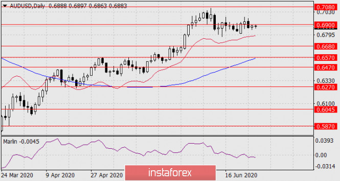 В четверг австралийский доллар подрос на 18 пунктов, но не вышел над целевой уровень-сопротивление 0.6900, чем подтвердил суточное закрепление под ним и намерение продолжить движение к целевому уровню 0.6680 (вершина 9 марта). Осциллятор Марлин в свою очередь закрепился под границей с территорией роста.