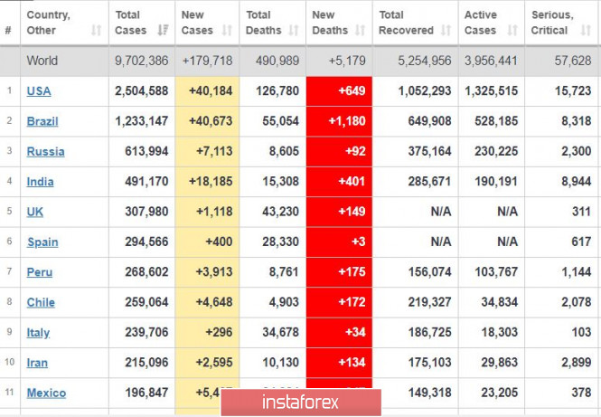 Торговый план 26.06.2020. EURUSD. Covid19: вторая волна в мире. Рынок СШАИнстаФорекс - Instaforex, 5 лет назад Коронавирус в мире: вторая волна (третья, если считать первой волну в Китае в январе-феврале). Мы видим резкий рост эпидемии в США - до +40 тысяч в сутки; Бразилия +40 тысяч и Индия почти +20 тысяч - без малого +100 тысяч всего три страны в мире, это гигантская цифра. У США и Трампа - большие проблемы. В Европе тоже неспокойно - рост заболеваний зафиксирован в 30 странах. В Германии в отдельных местностях возвращают жесткий карантин. В Украине максимальный рост с начала эпидемии, рост в Израиле. Причина очевидна - открытие экономик и резкое ослабление карантина - в ситуации отсутствия иммунитета и вакцины - естественно, рост заболеваний. В России - проводится огромное массовое мероприятие - голосование по Конституции - при этом в регионах больницы заполнены по максимуму, регионы России на пике эпидемии - спад, по сути, только в Москве и Петербурге. S&P500 - видим начало нового роста. Но рост не обоснован - можно строить тактику продаж со стопами выше недавних максимумов. EURUSD: Консолидация в диапазоне. Мы готовы купить от 1.1350. Мы готовы продать от 1.1165. В случае роста до 1.1260 и выше, уровень продаж будет на 1.1190. Материал предоставлен компанией InstaForex - www.instaforex.com |