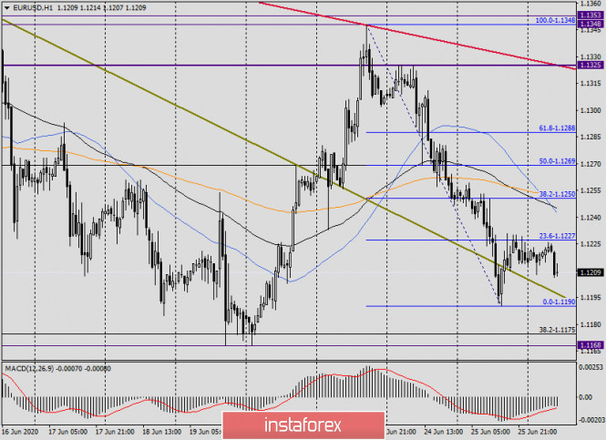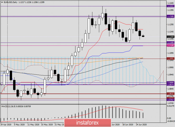 Анализ и прогноз по EUR/USD на 26 июня 2020 годаИнстаФорекс - Instaforex, 5 лет назад Здравствуйте, уважаемые коллеги! Вчерашний день выдался весьма насыщенным различного рода сообщениями и статистическими выкладками. В этом обзоре постараюсь коротко охватить всё наиболее важное и обозначить самые важные события сегодняшнего дня, после чего перейдём к рассмотрению графиков главной валютной пары рынка Forex. Итак, вчера Европейский Центральный Банк (ЕЦБ) опубликовал отчёт последнего заседания по денежно-кредитной политике, где признал принятые меры по противодействию COVID-19 для европейской экономики эффективными. В первую очередь имелась в виду скупка облигаций, или программа количественного смягчения (QE), размер которой составляет 1350 миллиардов евро. Пожалуй, это главный акцент из отчёта европейского Центробанка. Вчерашние данные из США по заказам на товары длительного пользования превзошли ожидания экономистов, а вот первичные обращения за пособием по безработице выросли выше прогнозов. С конкретными цифрами можно ознакомиться в экономическом календаре. Сегодня, в последний день недельных торгов, еврозона в 11:00 (мск) представит данные по денежному агрегату М3. Из Соединённых Штатов в 15:30 (мск) поступят отчёты по личным доходам и расходам американских граждан, а также будет опубликован базовый индекс цен расходов на личное потребление в месячном и годовом выражениях. Как вчера стало известно, ВВП США в первом квартале сократился на 5%, что не стало неожиданностью и совпало с прогнозами аналитиков. Daily На вчерашних торгах доллар США продолжил пользоваться спросом как безопасный актив по причине роста заражений COVID-19 в нескольких американских штатах. Также доллар получил поддержку на фоне торговых противоречий между США и Евросоюзом. В результате по итогам торгов четверга пара EUR/USD продемонстрировала нисходящую динамику и завершила торги на 1.1216. Несмотря на закрытие дня выше знаковой отметки 1.1200 и относительно длинную нижнюю тень, сегодня утром пара продолжает оставаться под давлением, которое пока носит достаточно умеренных характер. В случае продолжения медвежьего сценария, пара рискует опуститься в уже не раз обозначавшуюся сильную ценовую зону поддержки 1.1168-1.1148, где и будет, по моему мнению, решаться её дальнейшая судьба. Если быки по евро/доллару сумеют перехватить инициативу у своих оппонентов и начнут поднимать курс, им придётся столкнуться с сильным сопротивлением на 1.1260, где отмечены вчерашние максимумы, а также проходит линия Тенкан индикатора Ишимоку. Уверенное преодоление этой отметки и закрытие торгов выше 1.1260 усилят позиции покупателей и отправят пару в сильную техническую область 1.1300-1.1353. В случае прохождения 1.1353, следующими целями евробыков станут 1.1383 и 1.1422. Впрочем, до этих цен путь далёк, сложен и тернист, поэтому, учитывая рыночные настроения и техническую картину на дневном графике, наиболее вероятным представляется продолжение нисходящей динамики. С другой стороны, в последний день недельных торгов на фоне фиксации прибыли может произойти откат, и пара получит шанс несколько сократить потери, понесённые за последние два дня. Н1 На часовом графике в моменте завершения статьи давление на eur/usd усилилось и снижение стало более интенсивным. Как уже не раз отмечал в предыдущих материалах, пятница далеко не самы