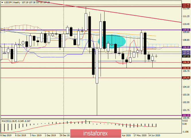 Анализ и прогноз по USD/JPY на 29 июня 2020 годаИнстаФорекс - Instaforex, 5 лет назад Здравствуйте! На торгах прошлой недели валютная пара доллар/иена продемонстрировала рост, укрепившись на 0.32%. Стоит отметить, что ситуация в мире лучше не стала. В ряде стран наблюдается всплеск второй волны COVID-19, в том числе и в самих Соединённых Штатах Америки. Кроме этого, в США не утихают массовые беспорядки, связанные с убийством чернокожего американца Джорджа Флойда. Также беспокойство у инвесторов вызывают напряженность в торговых отношениях США с Китаем и Евросоюзом. Тем не менее на торгах прошлой недели участники рынка отдали своё предпочтение американскому доллару, а не японской иене. На мой взгляд, основное значение здесь имели технические факторы. Давайте разбираться. Weekly На торгах 22-26 июня медведи вознамерились было продолжить давление на котировку, однако знаковый и сильный уровень 106.00 оказался им не по зубам. Именно в непосредственной близости от этой значимой отметки пара нашла сильную поддержку и стала активно восстанавливаться. Текущие торги начались с раскачки и пока проходят без определённой направленности. Оно и понятно — начало недели, все самые важные события ещё впереди. Среди большого количества макроэкономической статистики сразу стоит выделить данные по рынку труда США, которые будут опубликованы в эту пятницу, в 15:30 (мск). Более подробно обозначу это событие ближе к дате его выхода, а пока вернёмся к технической картине и обозначим ближайшие цели вверху и внизу на недельном таймфрейме. Итак, в случае продолжения восходящей динамики быкам по usd/jpy придётся ещё раз протестировать на пробой сильную зону сопротивления 107.45-107.65, где были показаны максимальные значения двух последних недель. Прорыв 107.65 откроет дорогу в сильную техническую область 107.92-108.11, где проходит нижняя граница облака индикатора Ишимоку, линия Тенкан и 50 простая скользящая средняя. Не стоит забывать и о важном уровне 108.00, который не раз оказывал значимое влияние на ход торгов. Таким образом, можно предположить, что закрытие текущих недельных торгов выше 108.11 укажет на превосходство быков над своими оппонентами и последующий рост, целями которого станут: 108.44 (верхняя граница облака), 108.86 (89 ЕМА) и 109.25, где проходит сильная 144 экспоненциальная скользящая средняя. Только пробой 144 ЕМА сделает возможным повторное тестирование сопротивления продавцов на 109.85 и важнейшей психологической и технической отметки в 110 иен за доллар. Для реализации медвежьего сценария по данной валютной паре необходим истинный пробой уровня 106.00 и закрытие недельных торгов под этой отметкой. Если игрокам на понижение курса удастся выполнить эту задачу, откроется дорога к ещё одной важной отметке 105.00. Судя по последней недельной свече, с достаточно длинной нижней тенью, больше склонен ожидать от USD/JPY роста. Daily На дневном таймфрейме наблюдается крайне любопытная картина, которая указывает на неопределённость участников рынка в отношении дальнейшего ценового движения данного инструмента. В частности, на это указывают последние две дневные свечи с длинными тенями и незначительными бычьими телами. Особенно это характерно для пятничной свечи за 26 июня. Теперь о роли 50 простой скользящей средней, которая выступает в качестве очень сильного сопротивления. Как видно на графике, доллар/иена