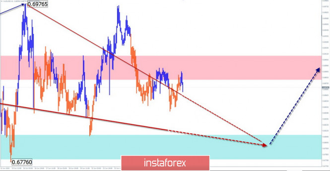 Упрощенный волновой анализ и прогноз GBP/USD и AUD/USD на 29 июняИнстаФорекс - Instaforex, 5 лет назад GBP/USD Анализ: С конца марта котировки английского фунта стерлингов формируют коррекционную структуру "растянутая плоскость". Ее заключительная часть стартовала 10 июня. На момент анализа цена формирует промежуточную коррекцию, по завершению которой снижение продолжится. Прогноз: В ближайшие сутки ожидается перемещение цены в коридоре между ближайшими встречными зонами. На европейской сессии не исключено кратковременное снижение. Доминирующий вектор на ближайшие сутки - север ценового графика. Зоны потенциального разворота Сопротивление: - 1.2430/1.2460 Поддержка: - 1.2350/1.2320 Рекомендации: Торговля на рынке фунта сегодня возможна в рамках внутрисессионного стиля. Приоритет следует отдать покупкам инструмента. Лот разумней снизить. В районе зоны сопротивления нужно готовиться к смене направления торговых сделок. AUD/USD Анализ: С середины марта на графике австралийского доллара доминирует восходящая волна дневного масштаба. Цена достигла нижней границы сильной зоны сопротивления. Весь прошедший месяц котировки формировали горизонтальную коррекцию. Ее структура на момент анализа не завершена. Прогноз: На ближайшей торговой сессии ожидается общий нисходящий настрой ценового движения. При смене курса не исключен кратковременный прокол верхней границы зоны сопротивления. Активная фаза снижения вероятна к концу суток. Зоны потенциального разворота Сопротивление: - 0.6880/0.6910 Поддержка: - 0.6810/0.6780 Рекомендации: Торговля на рынке австралийца сегодня возможна только при интрадее. Рекомендуются продажи инструмента. Предлагается отслеживать сигналы завершения текущей коррекции, чтобы на ее конце встать в длинные позиции. Пояснения: В упрощенном волновом анализе (УВА) волны состоят из 3 частей (А-В-С). Анализируется последняя незавершенная волна. Сплошным фоном стрелок показана сформированная структура, пунктирным - ожидаемые движения. Внимание: Волновой алгоритм не учитывает продолжительность движений инструмента по времени! Материал предоставлен компанией InstaForex - www.instaforex.com |
