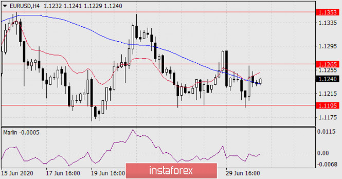 На четырёхчасовом графике цена на текущий момент выше линии Крузенштерна (голубая индикаторная), но ниже линии баланса (красная индикаторная), Марлин в зоне снижения, возможен возврат цены под линию Крузенштерна и возобновление нисходящего движения.