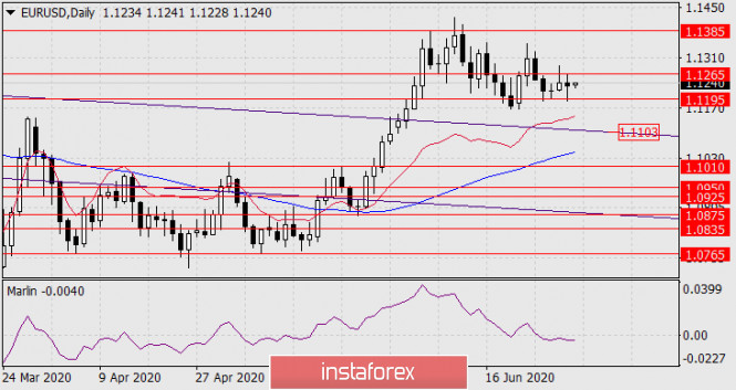 На графике дневного масштаба осциллятор Марлин продолжает снижение в области отрицательных значений. Уход цены под уровень 1.1195 откроет дорогу к первой цели 1.1103 – к поддержке трендовой линии ценового канала месячного таймфрейма.