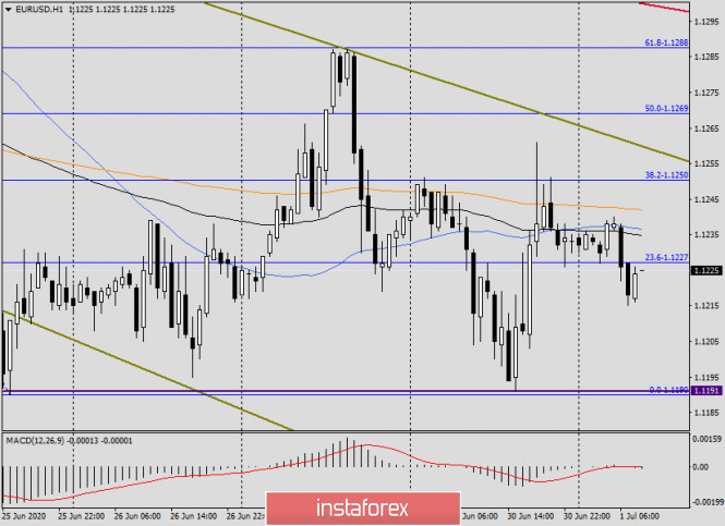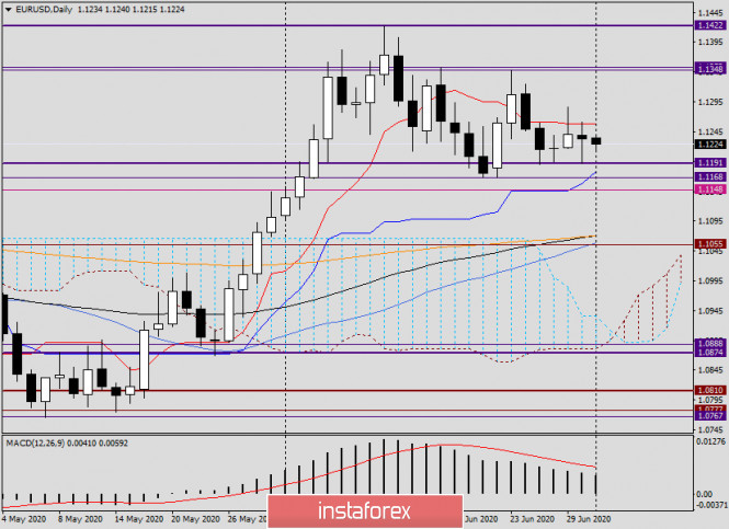 Анализ и прогноз по EUR/USD на 1 июля 2020 годаИнстаФорекс - Instaforex, 5 лет назад Здравствуйте, уважаемые коллеги! Итак, вчера рынок закрывал первый летний месяц, но, прежде чем перейти к разбору графиков цены, немного о фундаментальном фоне. Предварительные данные по индексу потребительских цен в зоне евро превысили прогнозы экономистов 0.1% и вышли на уровне 0.3%. При этом базовое значение индекса оправдало ожидания и составило 0.8%. Что касается американской статистики, то индикатор уверенности потребителей вырос больше ожиданий 91.8 и по факту составил 98.1. Основной упор в своём вчерашнем выступлении с полугодовым отчётом в Палате представителей председатель Федеральной Резервной Системы (ФРС) Джером Пауэлл сделал на кредитовании предприятий малого и среднего бизнеса. По мнению главы Федрезерва, беспрецедентная программа кредитования позволит в ближайшие месяцы повысить экономическую активность и сократить убытки, которые фирмы терпят в результате пандемии COVID-19. Что касается коллег из ЕЦБ, то там не исключают вероятность скорректировать ранее принятые антикризисные программы для противодействия COVID-19, но многое будет зависеть от способности глобальных рынков адаптироваться к медленному и постепенному экономическому восстановлению в Европе. Сегодня, в первый день июля, Германия отчитается по розничным продажам и опубликует данные по рынку труда. Однако, как представляется, самым важным событием будет публикация протоколов последней встречи FOMC, которая состоится в 21:00 по московскому времени. Monthly Первый летний месяц главная валютная пара рынка Forex завершила ростом, закрыв июньские торги на 1.1233. Однако это вовсе не означает, что укрепление курса будет продолжено. Главной причиной таких сомнений является очень длинная верхняя тень закрывшейся вчера свечи. Обычно, когда верхняя тень больше самого тела, это воспринимается как негативный сигнал и слабость игроков на повышение, которые не смогли удержать цену вблизи достигнутых максимумов. Также стоит обратить внимание на сильное сопротивление, которое оказывают 50 простая скользящая средняя и линия Киджун индикатора Ишимоку. Да и максимальные значения июньских торгов на 1.1422 пока выглядят недостижимыми, слишком сильным был отскок вниз от этого уровня. Теперь для подтверждения всей серьёзности своих намерений быкам по eur/usd необходимо пробивать сопротивление продавцов на 1.1422 и закрывать июльские торги выше этого уровня. На данном этапе такая задача выглядит весьма сложной, а, учитывая длинную верхнюю тень последней свечи, нисходящий сценарий приобретает больше шансов для своей реализации. На мой взгляд, окончательно обозначит превосходство медведей пробой линии Тенкан (1.1065) и закрытие торгов июля под этой линией. Daily На вчерашних торгах пара продемонстрировала разнонаправленные движения, что немудрено с учётом закрытия месяца. Вверх пару вновь не пустила линия Тенкан индикатора Ишимоку, которая выглядит как своеобразный шлагбаум и не даёт цене подняться выше. Впрочем, перед этим котировка продемонстрировала снижение и упала к уровню 1.1190. Кстати, эта отметка обозначалась во вчерашнем обзоре как ближайшая цель снижения и уровень, от которого можно пробовать покупать. Как видим, пара не подвела и всё чётко и точно отработала. Вот только представления о дальнейшем направлении 