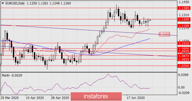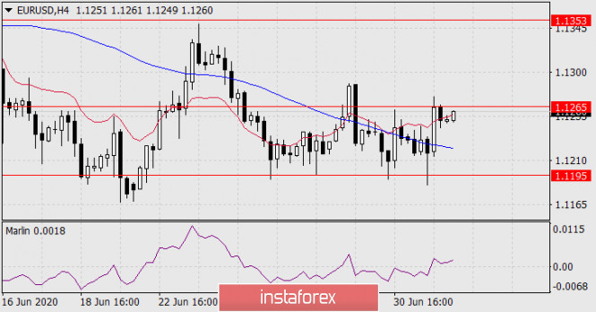 Прогноз по EUR/USD на 2 июля 2020 годаИнстаФорекс - Instaforex, 5 лет назад EUR/USD Закрепление цены над 1.1265 может за собой повлечь дальнейший рост к уровню 1.1385. Более надёжный уход цены под 1.1195 откроет «медвежью» цель 1.1103. Вероятно, такое поведение рынка связано с недостаточно сильными данными по американской экономике. В частном секторе в июне было создано 2,369 млн. рабочих мест против ожидания 2,850 млн. Деловая активность в промышленности (ISM Manufacturing PMI) в июне подросла до 52,6 с 43,1 пункта, но по итогу дня фондовый индекс Dow Jones снизился на -0,30%, а S&P500 подрос на 0,50%.