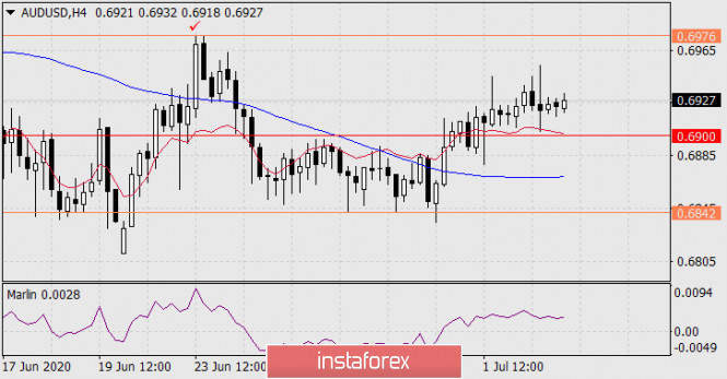 На четырёхчасовом графике цена закрепилась над индикаторными линиями баланса и Крузенштерна, Марлин в зоне роста, тенденция восходящая. Выход цены над верхний сигнальный уровень 0.6976 позволит цене продолжить рост к цели 0.7080 как развитие альтернативного сценария.