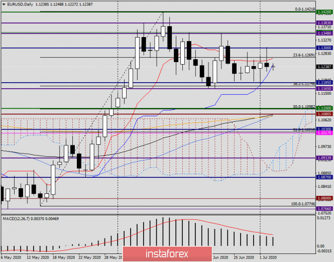 Анализ и прогноз по EUR/USD на 3 июля 2020 годаИнстаФорекс - Instaforex, 5 лет назад Здравствуйте, уважаемые коллеги! Вчерашняя публикация Nonfarm Payrolls и данных по безработице показала, что рынок труда США восстанавливается более быстрыми темпами, чем ожидали экономисты. В июне безработица в Соединённых Штатах опустилась к уровню 11.1%, хотя прогнозы сводились к отметке 12.4%. Причём если не изменяет память, такая тенденция наблюдается уже третий месяц кряду. То есть фактическое значение уровня безработицы третий раз подряд ниже прогнозируемых значений. Это ли не показатель восстановления рынка труда США? Ещё одним важнейшим фактором для американского рынка труда являются отчёты по Nonfarm Payrolls. Создание новых рабочих мест в несельскохозяйственных секторах американской экономики в июне выросло намного сильнее прогнозов, которые сводились к появлению трёх миллионов новых вакансий, а на самом деле число занятых выросло на 4.8 миллиона. Это рекорд с тех пор, как в 1939 году начали вести статистику! А заглянув в эту самую статистику, но только за последние три месяца, можно обнаружить, что фактические цифры по нонфармам превосходят прогнозы, причём довольно-таки значительно. Это ещё одно веское основание считать, что рынок труда в США активно восстанавливается, чего, к сожалению, нельзя сказать о ситуации с распространением COVID-19. Соединённые Штаты по-прежнему удерживают печальное лидерство по суточному числу инфицированных коронавирусом. По последним данным, суточный прирост заражённых COVID-19 составил в Штатах 52 000 человек. Всплеск пандемии может перечеркнуть начавшееся экономическое восстановление в США. Помимо хороших данных по американскому рынку труда, доллар был востребован в качестве безопасного актива в связи со вспышкой COVID-19 и продемонстрировал рост на вчерашних торгах по широкому спектру рынка. Впрочем, этот рост был весьма незначительный. Здесь впору говорить о том, что американская валюта приостановила свое падение, которое наблюдалось до этого. Daily Линия Тенкан индикатора Ишимоку и отметка 1.1300 стали настоящей ахиллесовой пятой для евробыков. Даже после выхода весьма позитивных трудовых отчётов из США, игроки на повышение не прекращали попыток продолжить подъём курса. Пара достаточно долго топталась вблизи 1.1287, и видно было желание рынка двигаться вверх, но сильная статистика из США, а также спрос на USD как на валюту-убежище сыграли свою главенствующую роль. В итоге пара всё-таки развернулась вниз и завершила торги четверга на 1.1239. При этом вчерашняя дневная свеча вполне может восприниматься участниками рынка как разворотная модель свечного анализа «Падающая звезда». Впрочем, в отсутствии американских игроков рынок сегодня будет тонким, а посему возможны любые варианты развития событий. Бычий настрой вернётся только в случае пробоя Тенкан (1.1266), а затем и отметки 1.1300. То есть, игрокам на повышение курса необходимо переписать или обновить вчерашние максимумы, которые находятся на уровне 1.1302, и завершить торговую сессию выше этой отметки. Но выполнима ли сегодня такая миссия? У медведей по EUR/USD не менее сложная задача. Им необходимо опустить курс в сильную зону поддержки 1.1185-1.1165, пробой уровня 1.1165, по моему мнению, окончательно укажет на превосходство продавцов единой европейской валюты. Переходя к торговым рекомендациям, ещё раз хоч