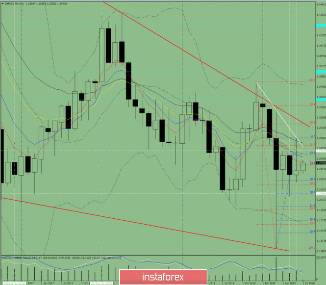 Технический анализ на июль месяц 2020 по валютной паре GBP/ USD.ИнстаФорекс - Instaforex, 5 лет назад Трендовый анализ. В июле от уровня 1.2397 (закрытие июньской месячной свечи) возможно восходящего движение с первой целью 1.2717 – откатный уровень 61.8% (красная пунктирная линия). В случае пробития этого уровня вверх следующая верхняя цель – 1.2992 линия сопротивления (красная жирная линия). Рис. 1 (месячный график). Индикаторный анализ: - индикаторный анализ – вверх; - уровни Фибоначчи – вверх; - объёмы – вверх; - свечной анализ – вверх; - трендовый анализ – вниз; - линии Боллинджера – вниз; Вывод по комплексному анализу - возможен вверх. Общий итог расчёта свечи валютной пары GBP/ USD по месячному графику: цена вероятней всего будет иметь восходящую тенденцию с отсутствием первой нижней тени (первая неделя месяца – белая) у месячной белой свечи и наличием второй верхней тени (последняя неделя чёрная). Верхние цели: от уровня 1.2397 (закрытие июньской месячной свечи) возможно восходящего движение с первой целью 1.2717 – откатный уровень 61.8% (красная пунктирная линия). В случае пробития этого уровня вверх следующая верхняя цель – 1.2992 линия сопротивления (красная жирная линия). Маловероятный сценарий – после верхней работы и достижения откатного уровня 50.0% - 1.2467 (красная пунктирная линия) - работа вниз до откатного уровня 38.2% -1. 2276 (синяя пунктирная линия). От этого уровня движение вниз с целью 1.2028 – откатный уровень 50% (синяя пунктирная линия). Материал предоставлен компанией InstaForex - www.instaforex.com |