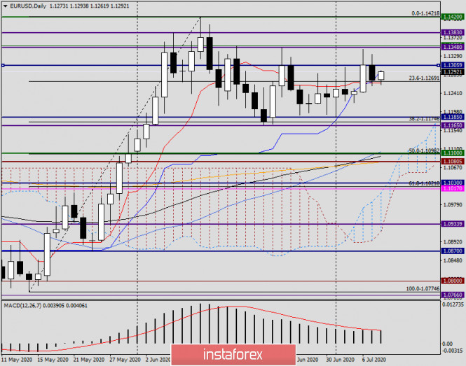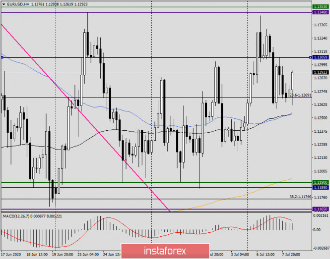 Анализ и прогноз по EUR/USD на 8 июля 2020 годаИнстаФорекс - Instaforex, 5 лет назад Здравствуйте, уважаемые коллеги! В ходе торгов текущей пятидневки валютная пара EUR/USD продолжает торговаться в диапазоне 1.1352-1.1185. Daily Именно такой торговый диапазон наблюдается с 16 июня, и это очень хорошо просматривается на дневной графике главной валютной пары рынка Forex. Вполне вероятно, что в ближайшее время евро/доллар продолжит сохранять бычий настрой, однако многое будет зависеть от способности быков по евро преодолеть очень сильное сопротивление продавцов, которое находится вблизи значимого технического уровня 1.1350. Только истинный пробой этой отметки откроет дорогу в северном направлении, где ближайшей целью станут максимальные значения торгов 10 июня на 1.1422. Если этот уровень будет пройден, наверняка движение вверх будет продолжено и пара протестирует важнейший психологический и технический уровень 1.1500. Очень серьёзная поддержка, как и раньше, наблюдается в ценовой зоне 1.1185-1.1165. Если эта зона будет пробита и eur/usd закрепиться ниже 1.1165, с большой долей вероятности можно будет предположить, что хозяевами рынка являются медведи. На вчерашних торгах пара снизилась, закрыв сессию вторника на уровне 1.1272. Несмотря на то что торги последних двух дней завершились выше линий Киджун и Тенкан индикатора Ишимоку, игрокам на повышение курса до сих пор не удаётся закрепиться выше ещё одной важной и значимой отметки 1.1300. Если в ближайшие дни этого сделать так и не получится, появятся существенные риски для разворота в южном направлении. Если участники рынка выберут именно такой маршрут, подтверждением снижения станут свечные сигналы на дневном, четырёхчасовом и часовом графиках евро/доллара. Н4 На этом таймфрейме котировка поднялась выше 89 экспоненциальной и 50 простой скользящих средних, закрепилась над ними гораздо более, чем тремя свечами подряд, и в моменте написания готовится дать откат к пробитым мувингам. Если торги будут проходить по такому сценарию, вблизи 1.1255 нужно отслеживать появление разворотных свечных сигналов, и если они появятся, пробовать покупки eur/usd. Ещё одним вариантом для открытия длинных позиций станет появление бычьих моделей свечного анализа в сильной ценовой зоне 1.1195-1.1165. На данном этапе сохраняют свою актуальность и продажи, которые лучше искать на часовом графике пары. Н1 На этом таймфрейме торги ведутся между оранжевой 200 экспоненциальной скользящей средней и 50 простой скользящей средней, которые выполняют функции поддержки и сопротивления, соответственно. При этом стоит обратить внимание, что в моменте завершения данной статьи цена отскакивает от 200 ЕМА и у текущей свечи может сформироваться длинная нижняя тень, что будет восприниматься как нежелание рынка снижаться. При возникновении такой ситуации появится возможность пробовать покупки с выносом стопа под длинный хвост обведённой свечи и целями в районе 1.1295-1.1300. В случае роста в район 1.1295-1.1300, где находятся 50 МА и сильный технический уровень 1.1300, и появления там медвежьих свечных сигналов появится возможность для открытия потенциально прибыльных коротких позиций. И хотелось бы заметить, что сегодняшний экономический календарь не пестрит обилием важной макроэкономической статистики, поэтому торги, на мой взгляд, будут проходить под воздействием технических факторов