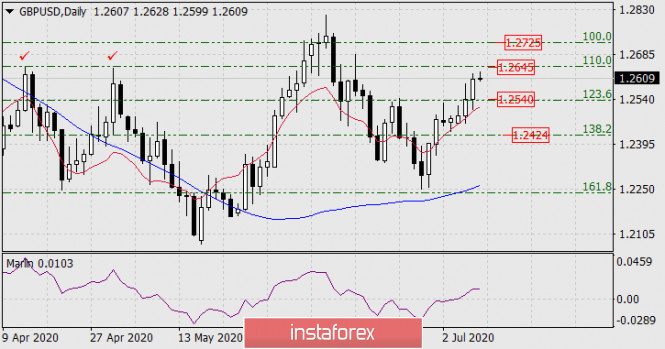 Как следствие, вполне возможен разворот цены от ближайшей цели 1.2645. Но насколько этот разворот окажется глубоким, определить нельзя – на дневном графике сформирован очень мощный растущий сентимент, его слом потребует от фунта многих усилий, пожалуй, единственным фактором, которому это под силу, будет провал переговоров по Брексит. Пока мы ждём коррекцию до уровня Фибоначчи 123,6% на цене 1.2540.