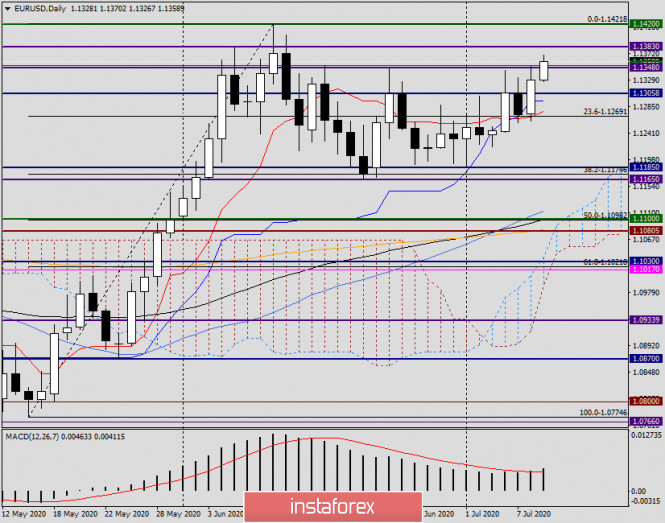 Анализ и прогноз по EUR/USD на 9 июля 2020 годаИнстаФорекс - Instaforex, 5 лет назад Здравствуйте, уважаемые коллеги! На вчерашних торгах главная валютная пара рынка Forex продолжила свой рост. И это несмотря на осторожность инвесторов в связи с продолжением распространения COVID-19. Главными очагами заражений новым типом коронавирусной инфекции по-прежнему остаются Соединённые Штаты Америки, вслед за которыми идут Бразилия и Индия. Так, по последним данным, суточное число заражений COVID-19 в США возросло до 55 тысяч. Тем не менее это не повысило спрос на доллар как на валюту-убежище. Как и предполагалось накануне, торги среды определялись в основном техническими факторами. К тому же вчера наблюдались позитивные настроения на фондовом рынке, а, как известно, в такие моменты спрос на американскую валюту падает и она дешевеет. Впрочем, оптимизм на мировых финансовых площадках нельзя назвать стабильным, так как участники рынков продолжают сохранять беспокойство относительно перспектив мировой экономики. Вчерашнее выступление представителя Федеральной Резервной Системы (ФРС) Бостика в целом сводилось к тому, что меры предпринятые Федрезервом для поддержки экономики в большей степени оказываются продуктивными. Тем не менее сохраняется неопределённость относительно сроков восстановления экономики, и это будет зависеть от ряда факторов, главным из которых является сила второй волны COVID-19. Если заглянуть в сегодняшний экономический календарь, то стоит выделить встречу Еврогруппы, которая начнётся в 11:00 (мск). Из американских отчётов внимание инвесторов привлекут первичные обращения за пособием по безработице, которые будут опубликованы в 15:30 по московскому времени. Ещё одно выступление президента ФРБ Атланты Рафаэля Бостика, которое начнётся в 19:00 (мск), вряд ли даст инвесторам новую пищу для размышлений. Тем не менее и это событие стоит учитывать тем, кто сегодня будет торговать или уже имеет открытые сделки. Переходим к рассмотрению технической картины по главной валютной паре. Daily Несмотря на вчерашний рост, пробить сопротивление продавцов на 1.1350 быкам по евро снова не удалось. Максимальные значения торгов среды были показаны на 1.1351, а цена закрытия вчерашней сессии оказалась на 1.1329. Как уже отмечалось во вчерашнем обзоре, игрокам на повышение курса никак не удавалось завершить дневную сессию выше знакового уровня 1.1300. И вот вчера это произошло. Что мы наблюдаем сегодня? На момент написания евро/доллар продолжает восходящую динамику, и торги ведутся вблизи 1.1364. То есть ненавистное и чрезвычайно крепкое сопротивление в районе 1.1348-1.1352 сейчас пробивается. Естественно, определять факт пробоя можно будет только после завершения сегодняшних торгов. Однако на данный момент eur/usd рвётся вверх и в случае продолжения подъёма проверит на прочность сопротивление продавцов на 1.1383. Если евробыкам удастся пройти и эту отметку, откроется дорога к важнейшему уровню 1.1422, от способности пробить который будет зависеть возможность подняться к психологическому уровню 1.1500, прямо под которым, на 1.1495, проходит ещё одно сильное сопротивление продавцов. Если под 1.1422 появятся разворотные свечные сигналы японских свечей, это станет основанием к развороту котировки в южном направлении, а значит надо будет рассматривать варианты для открытия коротких позиций по eur/