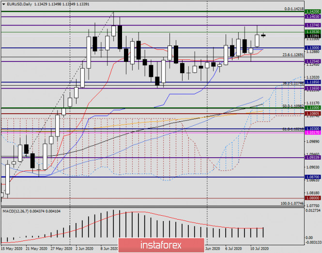 Анализ и прогноз по EUR/USD на 14 июля 2020 годаИнстаФорекс - Instaforex, 5 лет назад Наметился прорыв? Добрый день, уважаемые коллеги! На вчерашних торгах валютная пара EUR/USD продолжила рост и завершила сессию понедельника гораздо выше важной отметки 1.1300, на уровне 1.1343. При этом хоть и совсем немножко, но были обновлены максимальные значения на 1.1370, показанные 9 июля. Однако прежде чем перейти к разбору графиков цены главной валютной пары, необходимо упомянуть об одном важном моменте. По сообщению министерства экономики Германии, ведущая европейская экономика начала приходить в себя от последствий COVID-19. Впрочем, как говорится в пресс-релизе, этот процесс находится только в начальной стадии, а весь потенциал пока далёк от полного использования. Так, промышленное производство ФРГ уже коснулось дна, и теперь ожидается большое количество заказов и восстановление этой важнейшей отрасли немецкой экономики. В то же время отмечается низкий спрос со стороны стран с других континентов. Данный фактор таит в себе риски более длительного восстановления экономики Германии. Тем не менее данное заявление министерства экономики ФРГ было воспринято с оптимизмом участниками рынка и оказало влияние на укрепление курса единой европейской валюты. В целом на валютном рынке вчера наблюдался сдержанный оптимизм, что привело к давлению на американский доллар. Сегодня в плане публикации макроэкономической статистики достаточно интересный и важный день. Из еврозоны в 12:00 (мск) поступят данные по промышленному производству, а также индексу настроений в деловой среде от института ZEW. Соединённые Штаты в 15:30 (мск) опубликуют данные по индексу потребительских цен. Напомню, что это важнейший показатель, определяющий уровень инфляции в стране, а значит и шаги ФРС в своём решении относительно процентных ставок. Хотя понятно, что в условиях пандемии COVID-19, даже в случае хорошего роста потребительских цен, ни о каком повышении ставок и речи быть не может. Не до жиру... Daily Итак, главная валютная пара наконец-то завершила дневные торги выше 1.1300. Причём значительно выше, на уровне 1.1343. Напомню, что в последний раз торги закрывались над этой важной отметкой 8 июля, тогда цена закрытия составила 1.1329. Что дальше? А дальше евробыкам необходимо пробивать череду сильных уровней сопротивления: 1.1374, 1.1383, 1.1403 и 1.1422. Причём только после истинного пробоя (с закреплением) последней отметки можно будет считать, что рынок по евро/доллару находится под контролем игроков на повышение. Давайте прикинем, какие варианты развития событий могут произойти в ходе сегодняшних торгов. Бычий сценарий подразумевает перепись вчерашних максимумов на 1.1374 и уверенное закрытие выше этой отметки. В этом случае следующими целями быков по eur/usd станут уровни, обозначенные выше. Медведям для того, чтобы хозяйничать в рынке, нужно опустить котировку под знаковую отметку 1.1300. Кстати, именно здесь были показаны минимальные значения вчерашних торгов. Учитывая, что прямо под этим уровнем находятся линии Киджун и Тенкан индикатора Ишимоку, можно ожидать, что у продавцов возникнут серьёзные проблемы с продавливанием отметки 1.1300. При этом вовсе не исключаю и даже рассчитываю на сильную поддержку в ценовой зоне 1.1300-1.1290. Чем не вариант для того, чтобы рассматривать из выделенной зоны открытие длинных позиций? А вот да