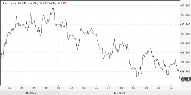 Индекс доллара по-прежнему сохраняет склонность к снижению, торгуясь в узком диапазоне. Во вторник в американскую сессию падение доллара к корзине конкурентов усилилось, индикатор уходил ниже отметки 96,30. Таким образом, он пробил вниз границу среднесрочного восходящего тренда.