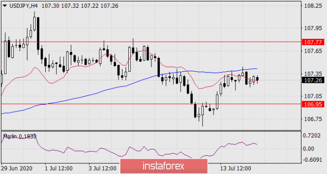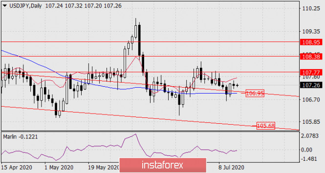 Прогноз по USD/JPY на 15 июля 2020 годаИнстаФорекс - Instaforex, 5 лет назад USD/JPY Вероятно, цена собирается с силами для преодоления сильной поддержки 106.95 – линии Крузенштерна близ вложенной линии ценового канала. Выход цены над вчерашний максимум 107.44 может продлить рост к целевому уровню 107.77.