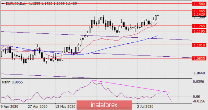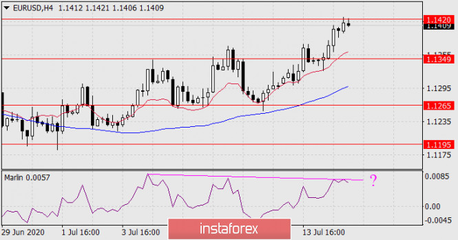 На графике Н4 уже почти сформирована двойная дивергенция по Марлину. Есть вероятность разворота цены от текущего уровня. Продолжение роста возможно ожидать после закрепления цены над 1.1420, вариант с разворотом станет актуальным после ухода цены под сигнальный уровень 1.1349, являющийся вершиной 23 июня. В этом случае целями станут отмеченные уровни на дневном графике: 1.1265, 1.1195.