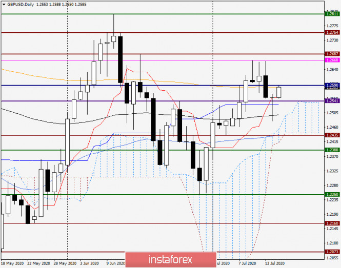 Анализ и прогноз по GBP/USD на 15 июля 2020 годаИнстаФорекс - Instaforex, 5 лет назад Доброго времени суток, уважаемые трейдеры! Вчерашние данные по ВВП Великобритании показали, что экономика Соединённого Королевства начала постепенное восстановление от последствий COVID-19. Впрочем, это восстановление носит пока ещё достаточно хрупкий характер. Основной причиной возрождения экономической активности стали снятие или смягчение целого ряда ограничений, которые правительство вынуждено было ввести для остановки распространения коронавирусной инфекции. Впрочем, заглянув в экономический календарь, видим, что британский ВВП вырос в мае на 1.8%, что значительно ниже прогнозного значения 5.5%. Тем не менее, после предыдущего показателя минус 20.3%, майский рост на 1.8% может вселять оптимизм. А в целом экономический спад в Великобритании, вызванный COVID-19, надо признать, стал беспрецедентным. Сегодня Управление национальной статистики Великобритании предоставит данные по индексу потребительских цен (они появятся уже после завершения данной статьи), а США опубликуют отчёты по промышленному производству, ценам на импорт и Бежевую книгу ФРС. Daily Как видим, данные по ВВП Великобритании за май, оказавшиеся ниже прогнозных значений, оказали существенное давление на британскую валюту. Однако, показав минимальные значения на 1.2479, пара GBP/USD начала активно восстанавливаться и в итоге завершила торги вторника там же, где их и начинала, на 1.2552. Причём, пункт в пункт! Безусловно, здесь стоит обратить внимание на длинную нижнюю тень вчерашней свечи, которая может сигнализировать о нежелании рынка двигаться в южном направлении. Необходимо отметить и поддержку, которую оказали цене линия Киджун индикатора Ишимоку и 89 экспоненциальная скользящая средняя. В итоге вчерашняя сессия завершилась ещё и выше линии Тенкан. По моему мнению, приведённые факторы указывают на потенциал роста стерлинга по отношению к доллару США. Как будет на самом деле, естественно, покажет ход торгов. В случае роста ближайшими целями вверху станут 200 экспонента, которая уже тестируется на пробой, а выше всё тот же злополучный для быков по фунту район 1.2640-1.2680. Если рынок предпочтёт нисходящий сценарий, то ближайшей целью станут вчерашние минимумы на 1.2479, обновление которых отправит пару к 1.2460, 1.2442 и 1.2420. Н4 На этом таймфрейме хорошо видна поддержка, которую оказали используемые мувинги, а конкретно оранжевая 200 экспоненциальная скользящая средняя. Именно отсюда пара развернулась вверх и торгуется в непосредственной близости от важного технического уровня 1.2600. Впрочем, после появления выделенной свечи дожи, у быков по фунту возникли проблемы. Теперь для продолжения роста им необходимо поглощать выделенную свечу. Если перейти к торговым рекомендациям по GBP/USD, то они сводятся к покупкам пары. Вчерашняя дневная свеча не должна остаться незамеченной участниками рынка, а после таких паттернов обычно происходит рост котировки. Как уже неоднократно отмечал, и это вовсе не секрет или какое-то открытие, покупать лучше подешевле, а продавать подороже. Именно поэтому рекомендую присмотреться к покупкам фунта после кратковременных откатов в ценовую зону 1.2555-1.2515. Подтверждающим сигналом, как обычно, будем считать бычью свечу (или свечи), которая появится на четырёхчасовом или часовом таймфреймах. Для т