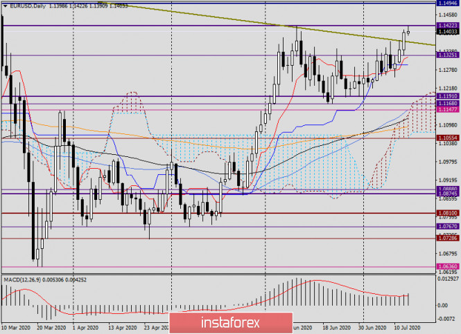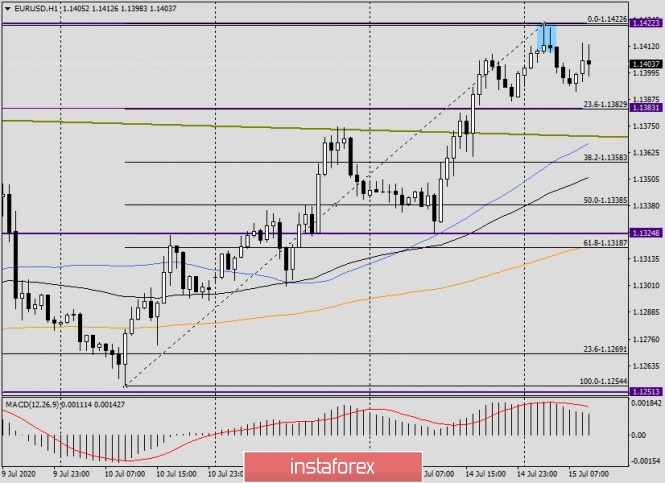 Анализ и прогноз по EUR/USD на 15 июля 2020 годаИнстаФорекс - Instaforex, 5 лет назад Здравствуйте, уважаемые коллеги! Ну что же, вчерашние предположения о прорыве EUR/USD вверх подтвердились. Впрочем, евробыкам не удалось до конца выполнить свою миссию. Торги вторника главная валютная пара рынка Forex завершила уверенным ростом, и это несмотря на то, что индекс потребительских цен в США и его базовое значение вышли лучше, чем ожидали экономисты. Впрочем, говорить о смене глобального нисходящего тренда по евро/доллару, по моему мнению, ещё рано. Такие рассуждения обретут смысл в случае пробоя психологического и технического уровня 1.1500, причём с обязательным закреплением выше этой отметки. Теперь немного о злободневной теме COVID-19, которая сдерживает оптимизм участников рынка и снижает аппетиты инвесторов к риску. В мире коварной пандемией заразилось уже более 13 миллионов человек. Соединённые Штаты Америки продолжают сохранять печальное лидерство по суточному числу инфицированных новым типом коронавируса. На этом фоне власти Калифорнии, где находится один из очагов COVID-19, решили повременить с отменой ряда ограничений. Более того, губернатор Штата стал инициатором введения новых ограничительных мер, в частности для бизнеса. Это может оказать пагубные последствия для американской экономики, которая только-только, казалось бы, начала восстанавливаться. Напомню, что ВВП Калифорнии составляет около 15% от общего валового внутреннего продукта Соединённых Штатов, а это достаточно серьёзная цифра. В Техасе и Флориде, где также лютует пандемия, ВВП составляет около 14%. Тем не менее это крайние и вынужденные меры, чтобы погасить очаг заражений COVID-19 и избежать более серьёзных последствий. Евросоюз на этой неделе надеется, на согласование всех условий фонда восстановления экономики еврозоны, что безусловно оказывает поддержку единой европейской валюте. Напомню, что саммит глав стран Европейского Союза пройдёт 17 и 18 июля. Daily Как уже отмечалось, на вчерашних торгах пара продемонстрировала хороший уверенный рост. В первую очередь об этом можно судить по фактору отсутствия длинной верхней тени, что указывает на силу быков по евро. В результате роста были пробиты сопротивления продавцов на 1.1374, 1.1383 и протестированы на прорыв ещё два важнейших сопротивления на 1.1403 и 1.1422. Что характерно, торги вторника закрылись на отметке 1.1399, что может вызывать лёгкое беспокойство игроков на повышение, так как показывает силу зоны сопротивления 1.1400-1.1425. Давайте обозначим её именно так. На сегодняшних торгах можно предположить повторное тестирование на пробой сильного сопротивления продавцов 1.1422. В этом случае возможны два варианта. Либо этот уровень будет пройден и торги закроются выше, либо попытка прорыва 1.1422 вновь окажется неудачной, появится разворотная модель свечного анализа, после чего пара уйдёт на коррекцию, а то и вовсе поменяет тренд. Н1 Если перейти на часовой график, то видим, что после появления двух выделенных разворотных свечей, на этом таймфрейме коррекционный откат уже происходит. Сегодня пара побывала на 1.1423, после чего начала откатывать вниз. Растянул сетку инструмента Фибоначчи на подъём 1.1255-1.1423, и здесь особое внимание стоит уделить первым двум откатным уровням: 23.6 и 38.2. Также не будем забывать и о пробитом уровне сопротивления 1.137. Если вблизи об