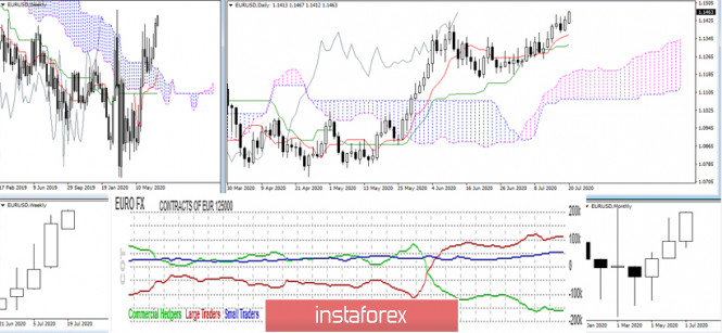 Последний отчет СОТ (Commitments of Traders). Недельные перспективы для EUR/USDИнстаФорекс - Instaforex, 5 лет назад Последний отчет СОТ (Commitments of Traders). Недельные перспективы для EUR/USD Очередной отчет СОТ (Commitments of Traders от 14.07.20.) вновь показал увеличение открытого интереса к европейской валюте – 604982 (14.07.20.) против 593341 (07.07.20.). Нужно отметить, что группы крупных игроков, показатели которых в большей степени используются при анализе отчетов, увеличили свои чистые позиции по доминирующим направлениям. Группа Non-Commercial увеличила поддержку игроков на повышение на 7315 (чистая позиция long 110912). Чистая позиция группы Commercial также в плюсе (short 162064 (+6934)), здесь нужно заметить, что, несмотря на прирост по сравнению с прошлым отчетом поддержка медведей всё же сократилась. Активнее всего увеличивали длинные позиции клиенты ведущих дилеров (чистая позиция 346064 (+18927)), в данной группе за отчетный период наблюдается максимальный процентный перевес открытых позиций 4,4 против 61,8. В результате интересен вывод, к которому пришли крупные игроки в общем отчете – итоговая чистая short позиция составила 51152, показав сокращение на 381. Основной вывод Поддержка игроков на повышение и уменьшение итогового долгосрочного перевеса соперника позволили за отчетный период обновить максимальные экстремумы и выйти за пределы длительной нисходящей коррекции. При сохранении подобной тактики игроки на повышение в ближайшее время могут продолжить усиление своих позиций. Техническая картина На графиках наблюдается восстановление восходящего тренда на дневном и недельном таймах, данное обстоятельство нашло подтверждение в расширении формирующихся бычьих облаков Ишимоку. Ближайшим значимым повышательным ориентиром сейчас является максимум мартовской свечи 1,1496, закрепление выше откроет дорогу к новым бычьим целевым перспективам. Значимые поддержки в сложившейся ситуации можно отметить в районе 1,1320-60 (дневной крест Ишимоку) и 1,1160 – 1,1200 (дневное облако + верхняя граница недельного облака + недельный Тенкан). На младших таймах при поддержке всех анализируемых технических инструментов сейчас идёт развитие восходящего тренда. Повышательными ориентирами внутри дня выступают сопротивления классических Пивот-уровней 1,1455 (R1) – 1,1483 (R2) – 1,1522 (R3). В случае развития нисходящей коррекции ключевые поддержки Н1 расположены сегодня в районе 1,1416 (центральный Пивот-уровень) – 1,1395 (недельная долгосрочная тенденция). Закрепление ниже изменит баланс сил на младших таймах и потребует новой оценки ситуации. Ichimoku Kinko Hyo (9.26.52), Pivot Points (классические), Moving Avarage (120) Материал предоставлен компанией InstaForex - www.instaforex.com |