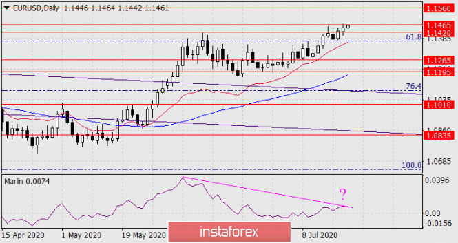 В понедельник евро подрос на 20 пунктов, но верхней тенью отметил верхнюю границу целевого диапазона 1.1420/65, чем, собственно, создал условие для формирования разворотной дивергенции с осциллятором Марлин. Конечно, рост евро может продолжиться, для этого цене нужно преодолеть 1.1465, тогда следующей целью станет уровень 1.1560 – исторический усреднённый уровень вершины января 2018 года и минимума ноября 2017 года. В этом случае образующая линия дивергенции по Марлину станет более пологой. В текущей ситуации движение вниз, к целевому уровню 1.1265 станет возможным при уходе цены под минимум 16 июля, он же уровень Фибоначчи 61,8% на графике дневного масштаба (1.1371).