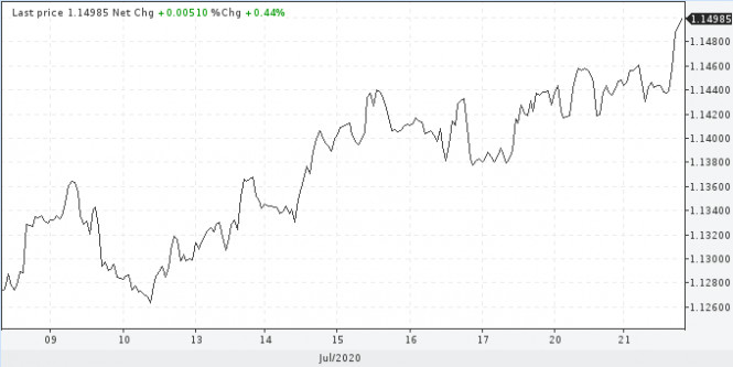 Важное соглашение лидеров ЕС о восстановлении экономики – сейчас для евро то, что доктор прописал. Впервые в истории страны блока дали старт эмиссии общеевропейских бумаг, что создаст настоящую угрозу превосходству доллара на финрынках. Находясь продолжительное время в депрессивном состоянии, европейская валюта может вырасти к многолетним максимумам. Один из прогнозов, который озвучили в Mizuho, предусматривает повышение евро к доллару в ближайшие месяцы до отметки $1,30. Эксперты допускают, что евро может занять место безопасного актива. После сделки его реальная стоимость должна составлять как минимум $1,22.