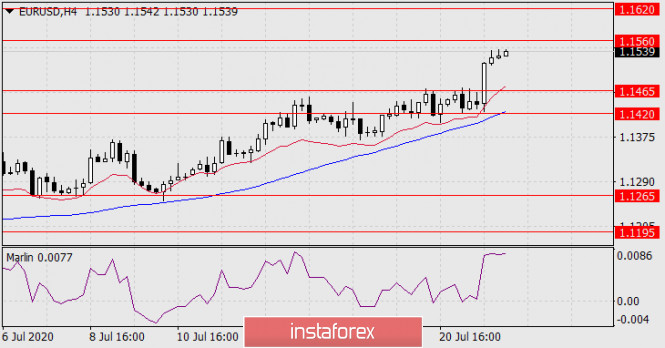 Вчера, на информации о наконец-то созданном 750-ти миллиардном фонде восстановления ЕС от коронавируса, евро подрос на 78 пунктов. Полученный импульс может ещё продолжить рост к пока не достигнутой цели 1.1560, возможно и к 1.1620, но вместе с угасанием самой новости и локальной перегретости рынка, о чём сигнализирует осциллятор Марлин образованием дивергенции с ценой, вероятен последующий разворот евро вниз в диапазон 1.1195-1.1265.