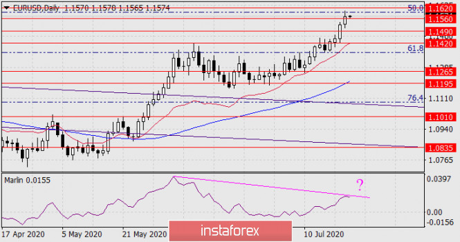 В среду евро подрос на 42 пункта, отметив верхней тенью ровно 50% от движения с февраля 2018 года по март 2020 года. С технической стороны данный рост усилил вероятность образования дивергенции с осциллятором Марлин. Образующая линия дивергенции становится менее крутой. После закрепления цены под 1.1560 ждём цену на важном уровне 1.1420, проходящего через вершину 10 июня.