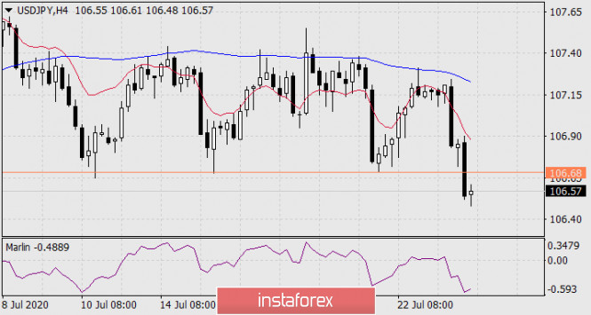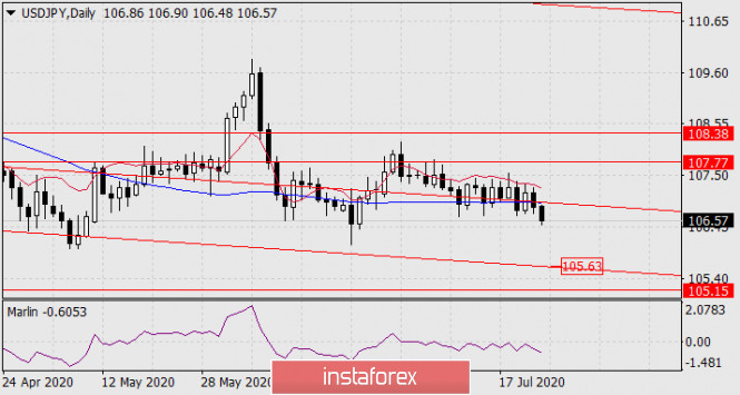 Прогноз по USD/JPY на 24 июля 2020 годаИнстаФорекс - Instaforex, 5 лет назад USD/JPY Осциллятор Марлин также усилил снижение, теперь ждём цену у поддержки вложенной линии ценового канала в районе отметки 105.63. Преодоление линии позволит цене снизиться к целевому уровню 105.15.