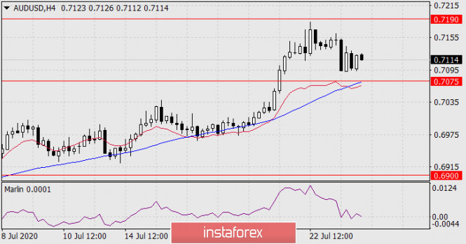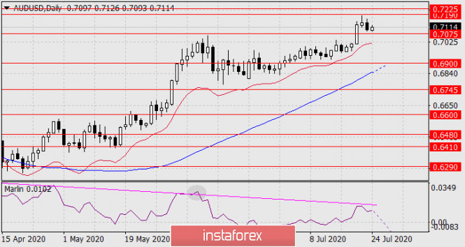 Прогноз по AUD/USD на 24 июля 2020 годаИнстаФорекс - Instaforex, 5 лет назад AUD/USD Но не смотря на наш оптимизм, цена ещё может войти в целевой диапазон 0.7190-0.7225 с тем, чтобы сигнальная линия осциллятора Марлин немного вышла над образующую дивергенцию линию и вернулась обратно под неё, как это было 8-го июня – этот момент обозначен на окне осциллятора серым овалом.