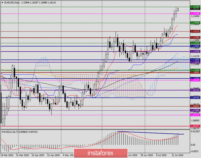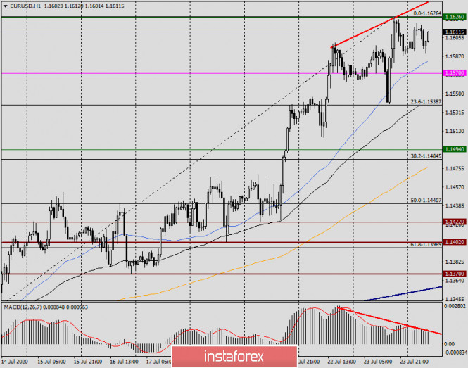 Анализ и прогноз по EUR/USD на 24 июля 2020 годаИнстаФорекс - Instaforex, 5 лет назад Здравствуйте, уважаемые коллеги! На вчерашних торгах единая европейская валюта продолжила укреплять свои позиции против доллара США. Участники рынка выражают беспокойство, что не утихающая в США пандемия COVID-19 окажет негативное влияние на ведущую мировую экономику, которая будет восстанавливаться более медленными темпами. Очередной виток напряжённости между Вашингтоном и Пекином также оказал американской валюте медвежью услугу, причём как в прямом, так и переносном смысле. Консульство Китая в Хьюстоне было обвинено в шпионаже, и ему дали 72 часа для завершения своей дипломатической миссии. В этих условиях инвесторы отдают своё предпочтение традиционным валютам-убежищам, коими считаются швейцарский франк и японская иена. А вот «американец» нынче не в почёте. К тому же, согласно вчерашним данным, в Соединённых Штатах выросло число заявок на получение пособия по безработице. Это произошло впервые за последние 4 месяца, и, по мнению автора, в большой степени является отголосками эпидемии COVID-19. Заглянув сегодняшний экономический календарь, можно выделить индексы деловой активности в производственном секторе и секторе услуг Германии (10:30 мск), еврозоны (11:00 мск) и США (16:45 мск), а также данные по продажам нового жилья в США, которые будут опубликованы в 17:00 по московскому времени. Daily На вчерашних торгах в результате роста пара показала максимальные значения на 1.1626, однако удержаться на пике не смогла и немного откатила, завершив сессию четверга на отметке 1.1595. Полагаю, что вокруг 16 фигуры может развернуться серьёзная борьба за итоговую цену закрытия сегодняшних и недельных торгов. Если евробыкам удастся завершить день и всю неделю выше 1.1600, откроется дорога к ещё одному важному и сильному техническому уровню 1.1700. Впрочем, эти перспективы приобретут реальные очертания уже на следующей неделе. Непрерывный пятидневный рост главной валютной пары рынка Forex предполагает высокую вероятность коррекционного отката, только вот когда он произойдёт, просчитать довольно сложно. Пара пребывает в достаточно сильном восходящем тренде, который может продолжиться и сегодня. Хотя перед выходными всегда есть высокая вероятность фиксации позиций (в данном случае длинных), что и может спровоцировать некоторую корректировку курса. Для этого могут быть использованы такие сильные ценовые зоны, как 1.1600-1.1625 сегодня и 1.1700-1.1715 на следующей неделе. У медведей в текущей ситуации задача весьма сложная, и для того чтобы хоть как-то поправить свои дела, им нужно не допустить пробоя значимого уровня 1.1600 и попытаться закрыть торги не только ниже этого уровня, но и под отметкой 1.1570. Как уже отмечалось, такому исходу сегодняшних торгов может поспособствовать фиксация прибыли, а также сохраняющаяся медвежья дивергенция индикатора MACD. H1 Медвежья дивергенция MACD, причём серийная, наблюдается и на часовом графике, что вместе с дневным дивером является серьёзным потенциалом для корректировки eur/usd. Несмотря на сильные бычьи настроения по евро/доллару, покупать пару на хаях, да ещё и в последний день недельных торгов, по моему мнению, весьма и весьма некомфортно. Для тех кто всё же сегодня непременно хочет поторговать, рекомендую рассмотреть два варианта. Первый - это позиции по тренду, то есть п