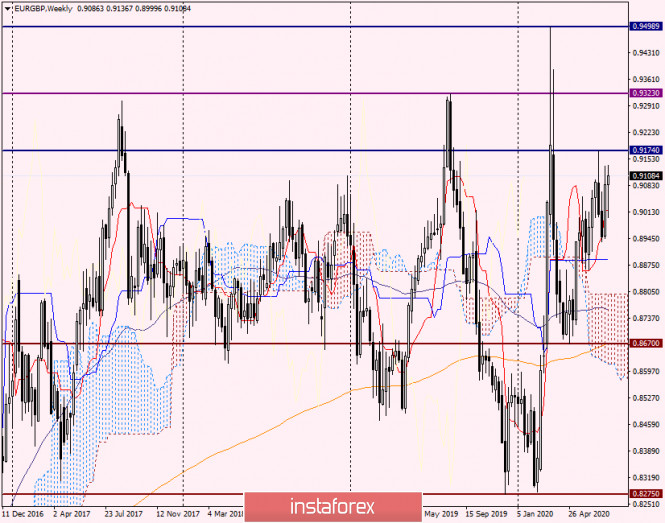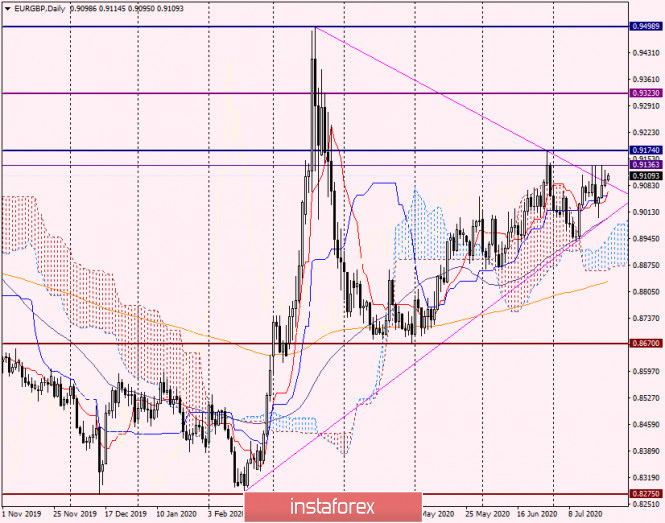 Анализ и торговые идеи по EUR/GBP от 24 июля 2020 годаИнстаФорекс - Instaforex, 5 лет назад Доброго времени суток, уважаемые трейдеры! Давно не рассматривали кросс-курс евро/фунт, и сегодня уделим этому инструменту внимание. В основном анализ eur/gbp будет носить технический характер, однако тему Brexit, как ни крути, обойти стороной не получится. На данный момент, особенно после компромисса, рождённого в муках, на четырёхдневном саммите глав стран, входящих в Евросоюз, фундаментальная составляющая для единой европейской валюты представляется более благоприятной, нежели для фунта стерлингов. Что касается «британца», то для него сохраняются риски, связанные с выходом Великобритании из Европейского Союза. Как именно кабинет британского премьера Бориса Джонсона завершит процесс Brexit из ЕС и расставит точки по всем остающимся нерешёнными вопросам, пока можно лишь предполагать. Впрочем, времени для достижения окончательных договорённостей ещё предостаточно. Было бы желание в достижении компромиссов. Напомню, что процедура выхода Соединённого Королевства из состава Евросоюза должна полностью завершиться до 31 декабря текущего года. Вопрос в другом - хватит ли у расстающихся сторон политической воли для того, чтобы достичь все договорённости по спорным вопросам и расставить все точки над i. Пока все раунды переговоров между сторонами бракоразводного процесса переносятся на более поздние сроки. При этом в Брюсселе считают, что процедура Brexit должна завершиться в октябре. Тем не менее сохраняется вероятность того, что Великобритания покинет ЕС без заключения сделки. В принципе, в этом и заключаются основные риски для британской экономики и курса национальной валюты. По моему личному мнению, Борис Джонсон довольно сложный и непредсказуемый переговорщик, и в этом он чем-то, помимо рыжей шевелюры, походит на американского президента Дональда Трампа. Посмотрим, чем в итоге завершится бракоразводный процесс между Великобританией и ЕС, Ждать остаётся недолго. А нам пора переходить к рассмотрению графиков кросс-курса EUR/GBP. Weekly Как хорошо видно на недельном графике, пару изрядно мотает из стороны в сторону и евро/фунт со второй половины 2016 года торгуется в широком диапазоне 0.8275-0.9500. В апреле этого года кросс нашёл сильную поддержку на 0.8670, после чего демонстрирует преимущественно восходящую динамику. Естественно, что без откатов не обходится. Итак, ближайшее сопротивление проходит на 0.9174. Если быкам по eur/gbp удастся закрыть неделю выше этого уровня, с большой долей вероятности его пробой можно будет считать состоявшимся. В этом случае откроется дорога к следующему сильному сопротивлению продавцов, которое проходит в районе 0.9323. Как видим, предыдущая попытка пробить этот уровень не увенчалась успехом. Несмотря на существенный залёт цены выше, к психологической отметке 0.9500, оттуда произошёл сильный отскок вниз, пришлось всё начинать сначала. Daily На момент завершения статьи пара торгуется вблизи 0.9100 и пытается выйти вверх из треугольника, обозначенного розовыми линиями. Здесь хотелось бы обратить внимание, что треугольники довольно-таки коварные фигуры технического анализа. Нередко первоначальный выход в одну из сторон такой фигуры является ложным, после чего цена разворачивается в противоположную сторону и уже истинно выходит из треугольника. Дне