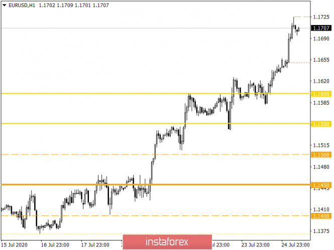 Горящий прогноз по EUR/USD на 27.07.2020 и торговая рекомендацияИнстаФорекс - Instaforex, 5 лет назад Всю прошлую неделю, доллар находился под постоянным давлением, и единая европейская валюта росла буквально безостановочно. Но если по началу, причиной ослабления доллара были исключительно политические факторы, то потом, все стало несколько интереснее. Оказалось, что положение дел в американской экономике, особенно в сравнении с Европой, смотрится как-то не очень. Так что предварительные данные по индексам деловой активности, буквально добили доллар. И это несмотря на то, что единая европейская валюта уже не просто перекуплена. Рынок буквально перегрет, и коррекция уже напрашивается сама по себе. Она вполне может случится теперь и на пустом месте. Так вот, европейский индекс деловой активности в сфере услуг вырос с 48,3 до 55,1, вместо ожидавшихся 50,8. Производственный индекс, который должен был вырасти с 47,4 до 49,8, подрос до 51,1. В результате, составной индекс деловой активности вырос с 48,5 до 54,8. Прогнозировалось, что он вырастет до 50,7. Примечательно то, что все индексы выросли не просто больше, чем ожидалось. Они все поднялись выше отметки в 50,0 пунктов, отделяющей стагнацию от роста. Иными словами, индексы деловой активности указывают на то, что европейская экономика уверенно восстанавливается. Что конечно же никак не способствует коррекции на валютном рынке. Составной индекс деловой активности (Европа): А вот в Соединенных Штатах, хоть индексы и выросли, но результаты оказались хуже прогнозов. Например, индекс деловой активности в сфере услуг вырос с 47,9 до 49,6, хотя должен был вырасти до 50,4. Производственный же индекс подрос с 49,8 до 51,3, а не до 51,5, как ожидалось. В общем, составной индекс деловой активности вырос с 47,9 до 50,0. Ожидалось, что он вырастет до 50,8. И тут важно то, что индекс деловой активности в сфере услуг, все еще ниже 50,0 пунктов. Так что восстановление американской экономики идет крайне тяжело и медленно. При этом, сохраняются риски дальнейшего спада. Именно это и пугает инвесторов, и не позволяет доллару найти опору. Составной индекс деловой активности в сфере услуг (Соединенные Штаты): Грубо говоря, минувшая неделя приучила инвесторов к тому, что американская статистика выходит заметно хуже прогнозов. Так что, наученные горьким опытом участники рынка, уже с самого начала новой торговой недели, стали закладывать именно такое развитие событий. То есть, никто не верит, что заказы на товары длительного пользования вырастут на 5,0%. И это при том, что есть немногочисленные расчеты, показывающие, что заказы могут и вовсе увеличиться на 7,2%. Лучше заранее готовится к худшему. Причем для этого есть все основания, в виде индекса деловой активности в сфере услуг. Таким образом получается, что худший вариант развития событий, уже заложен в стоимость единой европейской валюты, и если данные действительно окажутся хуже прогнозов, то расти ей будет просто некуда. Но, в случае подтверждения прогнозов, мы наконец увидим долгожданную коррекцию. Заказы на товары длительного пользования (Соединенные Штаты): Валютная пара евро/доллар продолжила вскарабкивание по вертикальному ходу, вследствие чего был обновлен максимум текущего года 1,1650 --> 1,1725, а сигнал перепроданности американского доллара приобрел небывалый масштаб. Спекулянты продолжают работу не обраща