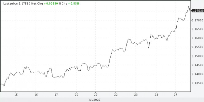 На этой неделе трейдеры сконцентрируются на заседании Федрезерва, которое стартует во вторник. Серьезных заявлений не ожидается, но финансовые чиновники могут начать закладывать основу для дальнейших действий в сентябре или позже в этом году. Риторика Джерома Пауэлла способна направить доллар в ту или иную сторону. Наиболее вероятным является движение вниз. Глава ФРС ранее выражал надежду на то, что экономика может восстановиться во втором полугодии, но текущая эпидемиологическая обстановка спутала все карты и, похоже, вынудит Пауэлла кардинально изменить свои взгляды. Любое упоминание отрицательных ставок сильно ударит и по без того слабому доллару, который, как ожидается, будет снижаться как до заседания ФРС, так и после.