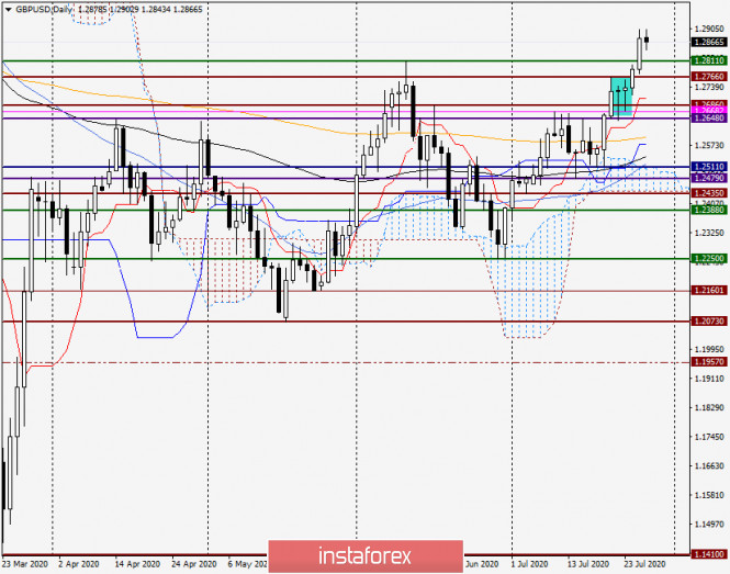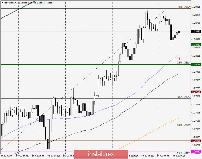 Анализ и прогноз по GBP/USD на 28 июля 2020 годаИнстаФорекс - Instaforex, 5 лет назад Доброго времени суток, уважаемые трейдеры! В преддверии решения Федеральной Резервной Системы (ФРС) США по процентным ставкам и последующей пресс-конференции председателя этого ведомства Джерома Пауэлла, доллар США продолжает нести потери по всему спектру валютного рынка. Маловероятно, что риторика главы ФРС окажет существенную поддержку американской валюте и в корне изменит ситуацию. А если ещё учесть неутешительные прогнозы по ВВП США за второй квартал, которые сводятся к минус 34.1%, перспективы дальнейшего падения американской валюты выглядят весьма и весьма вероятными. Заглянув в сегодняшний экономический календарь, можно отметить индекс розничных продаж по данным Конфедерации британских промышленников, который будет опубликован в 13:00 по московскому времени. Позднее, в 16:00 (мск), Соединённые Штаты представят на суд инвесторов отчёт по ценам на жилье от S&P, а в 17:00 (мск) будет опубликован индекс уверенности потребителей. А тем временем в Соединённых Штатах дан старт новому этапу по разработке и созданию вакцины от COVID-19. В Великобритании учёные из Оксфорда во второй фазе исследования добились положительных результатов при тестировании вакцины от нового типа коронавирусной инфекции. Продвигается разработка вакцины от COVID-19 и Российской Федерации. Впрочем, пока суть да дело, США удерживает мировое лидерство по суточному приросту числа инфицированных, а Европе усиливаются опасения, что вторая волна коронавируса может захлестнуть континент. Daily В результате вчерашнего достаточно существенного роста валютная пара фунт/доллар поднималась к сильному техническому уровню 1.2900, но торги понедельника завершились под этой отметкой, на 1.2877. Тем не менее, глядя на график, видим, что пара более чем уверенно преодолела сопротивление на 1.2811, что открывает дорогу к дальнейшему движению в северном направлении. В моменте написания gbp/usd торгуется с незначительным понижением вблизи 1.2861. В случае продолжения подъёма и обновления вчерашних максимальных значений, пара протестирует сильную ценовую зону 1.2930-1.2960. Если этот район будет пройден, фунт/доллар устремится в не менее значимую психологическую и техническую область 1.3000-1.3050. Понятно, что в такой ситуации основной торговой рекомендацией стоит считать покупки, которые лучше открывать не на пике рынка, а после коррекционных откатов. Н1 Сегодняшние попытки пары пробить значимый уровень 1.2900 успехом не увенчались. От 1.2902 состоялся коррекционный откат, который завершился уже на 1.2843, после чего пара разворачивается вверх и демонстрирует намерения ещё раз попытать счастья на прохождении 29-й фигуры. Итак, основной торговой рекомендацией являются покупки. Рискованно и агрессивно можно попробовать купить стерлинга с текущих цен, вблизи 1.2863. Менее рискованно и по более выгодным ценам предлагаю рассматривать открытие длинных позиций по GBP/USD после кратковременного снижения в ценовую зону 1.2825-1.2800. При этом в случае закрепления котировки под уровнем 1.2800, в дальнейшей способности фунта двигаться в северном направлении возникнут некоторые сомнения. Учитывая силу уровней 1.2900, 1.2930 и 1.2960, появление вблизи перечисленных отметок медвежьих свечных моделей можно использовать для открытия продаж с небольшими целями в районе 1.286