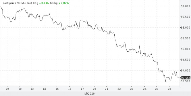 О развороте тенденции говорить преждевременно. Среднесрочный тренд, как и долгосрочный, по-прежнему нисходящий, поэтому не стоит спешить с покупками. Нужно дождаться уверенной фиксации над уровнем 93,75, где проходит линия среднесрочного нисходящего тренда. Пока этого не происходит. В июле доллар просел на 3,6%. Для того чтобы он смог избежать худшего месяца за один десяток лет, нужна не просто коррекция, а достаточно серьезный скачок вверх.
