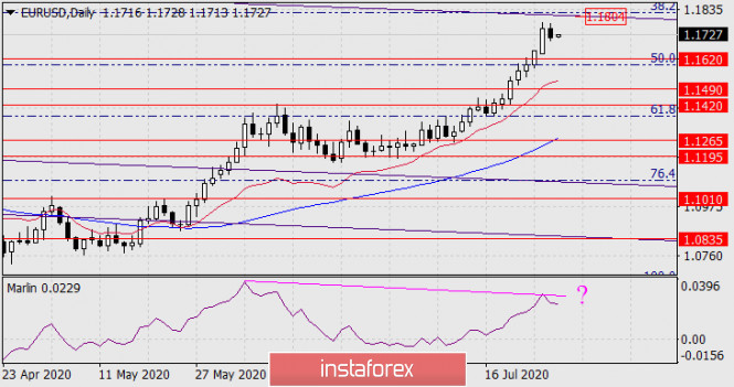 Вчера евро снизился на 34 пункта. Для формирования дивергенции с осциллятором Марлин это понижение оказалось своевременным. Но потенциал роста сохраняется, цель 1.1804 по границе глобального ценового канала, берущего начало с июля 2008 года ещё может быть отработана. Здесь же пролегает и уровень 61,8% коррекции ветки падения с февраля 2018 года по март 2020 года. На графике уровень промаркирован 38,2%, так как сетка Фибоначчи перевёрнута для определения уровней реакции ожидаемого долгосрочного понижения. Сформируется ли дивергенция окончательно или цена предпочтёт рост, станет известно после сегодняшнего решения ФРС по монетарной политике.