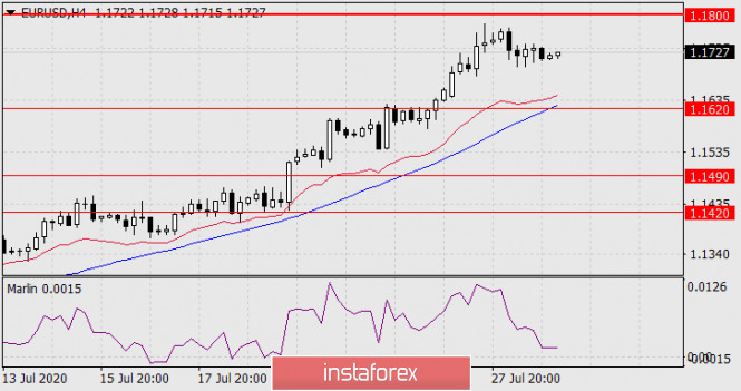 На графике четырёхчасового масштаба Марлин ещё находится в зоне растущей тенденции. Его опережающее снижение говорит о намерении перейти в зону «медведей», чем будет показано опережающее направление цены. Но более сильным и надёжным указанием к дальнейшему снижению станет закрепление цены под уровнем 1.1620, что также станет закреплением под индикаторной линией Крузенштерна. В этом случае целью евро станет уровень 1.1490.