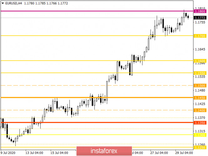 Горящий прогноз по EUR/USD на 30.07.2020 и торговая рекомендацияИнстаФорекс - Instaforex, 5 лет назад Возможно, что вчерашнее заседание Федерального комитета по операциям на открытом рынке было самым бесполезным за последнее время. Единственное, что мы услышали, так это то, что Федеральная Резервная Система готова принять все необходимые меры для поддержки экономики. И больше ничего. То есть вообще никакой конкретики. Так что совершенно непонятно, какие именно меры готова принять Федеральная Резервная Система. А самая главное - конкретно при каких условиях. По сути дела, ничего нового мы не узнали. Так что в целом ситуация осталась неизменной. А значит, доллар продолжил терять свои позиции. Хотя с самого начала торгового дня, единая европейская валюта несколько снижается. Хотя само снижение скорее носит чисто символический характер. Просто самой единой европейской валюте уже практически некуда расти. Она существенно перекуплена. Так что для роста ей нужны серьезные стимулы. Кроме этого, у нее и так есть повод для снижения в виде данных по уровню безработицы, который должен вырасти с 7,4% до 7,8%. Что, естественно, является крайне негативным фактором. Так что до начала американской сессии единая европейская валюта, скорее всего, будет постепенно снижаться. Уровень безработицы (Европа): И по идее, рост уровня безработицы в Европе вкупе с чрезмерной перекупленностью единой европейской валюты должен привести к резкому ее ослаблению. Однако реакция будет относительно сдержанной, так как главным событием дня является публикация предварительной оценки ВВП Соединенных Штатов за второй квартал. Весь фокус в том, что эти данные должны показать сокращение экономики аж на 33,0%. И это всего за один квартал. И это не просто какой-то там уровень безработицы, это экономика в целом. Так что у доллара действительно нет поводов для роста. Единственное, что хоть как-то может сгладить негатив, так это данные по заявкам на пособия, которые должны продолжить постепенно сокращаться. Так, число первичных заявок на пособия по безработице может уменьшиться с 1 416 тыс. до 1 400 тыс. Число же повторных заявок должно сократиться с 16 197 тыс. до 16 000 тыс. Однако видно, что темпы сокращения числа заявок явно крайне медленные, что тоже является несколько негативным фактором. Иными словами, у доллара пока нет поводов для оптимизма. Темпы роста ВВП (Соединенные Штаты): Валютная пара евро/доллар завершила минувший день очередным обновлением локального максимума, в итоге котировка успешно проколола тенями уровень 1,1800, сигнализируя о возможном дальнейшем строении бычьего тренда. Перекупленность европейской валюты имеет место уже не одну неделю, но это не останавливает спекулянтов от дальнейших действий, фактически именно за счет них мы вырисовываем вертикальный ход цены и демонстрируем высокие показатели волатильности на рынке. На торговом графике в общем плане (дневной период) можно увидеть, что до пробоя точек сопротивления июня и сентября 2018 года осталась всего 50-80 пунктов. Отсутствие коррекционного движения приводит к высокой нестабильности вертикального хода цены. Можно предположить, что логичнее всего было бы увидеть коррекционный ход в направление значений 1,1650-1,1600, но спекулянтов не останавливает перегрев европейской валюты, да и вертикальный ход цены. Поэтому фиксация вы