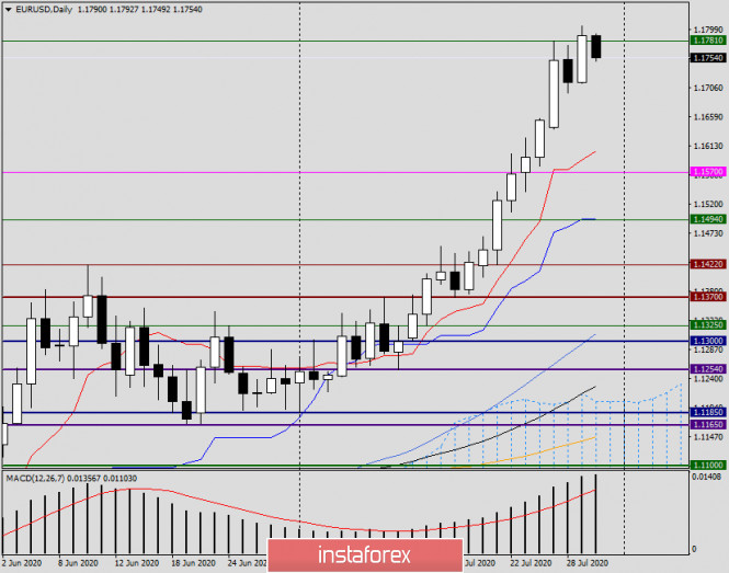 Анализ и прогноз по EUR/USD на 30 июля 2020 годаИнстаФорекс - Instaforex, 5 лет назад Экономика США будет зависеть от COVID-19 Здравствуйте, уважаемые коллеги! Ну что же, начнём с главного. По итогам завершившегося вчера двухдневного заседания американского Центробанка было принято решение не менять параметры денежно-кредитной политики и сохранить основную процентную ставку в диапазоне 0.00-0.25%. При этом Федеральная Резервная Система (ФРС) продолжит осуществлять беспрецедентную программу скупки облигаций, минимальный месячный объём которой определяется суммой 120 миллиардов долларов. Федрезерв заявил, что ставки будут оставаться на текущих низких уровнях, пока появятся чёткие сигналы, что ведущая мировая экономика восстанавливается. Пока же в американском Центробанке отмечают улучшение экономической ситуации, но она всё равно хуже, чем была до COVID-19. Касательно операций по валютным свопам, они будут пролонгированы до 31 марта 2021 года. Инфляция остаётся ниже целевого уровня 2% из-за низких цен на нефть и слабого спроса. Что касается дальнейших перспектив американской экономики, то они целиком и полностью будут зависеть от степени негативных последствий эпидемии коронавируса. По крайней мере, влияние пандемии COVID-19 на экономику США будет наблюдаться как в краткосрочной, так и в среднесрочной перспективах. Никакой конкретики. Ну и уже традиционно в ФРС подчеркнули готовность использовать весь спектр имеющихся инструментов в случае такой надобности. На своей пресс-конференции председатель ФРС Джером Пауэлл также, в основном, затронул тему влияния на экономическую активность пандемии коронавируса. Глава ФРС ясно дал понять, что дальнейший экономический курс в стране будет крайне неопределённым. Весьма удобная позиция - списывать все помехи экономического восстановления на коронавирус. Естественно, пандемия нанесла существенный удар по американской экономике, но ведь были приняты меры по её поддержке. Где же положительные результаты? Нет, они конечно же в последние месяцы прослеживаются, но вот так всё списывать на ковид может и монетарный чиновник гораздо более низкого ранга. Ох, не этого ждали от Пауэлла участники рынка, а также его однопартиец и протеже на должность главы ФРС Дональд Трамп. Как известно, президент США никогда не был сторонником введения в стране жёстких ограничительных мер. Трампу необходим скорейший перезапуск и восстановление американской экономики. Данный фактор является его основным козырем в рукаве в борьбе с Джо Байденом на предстоящих президентских выборах. А тут злосчастная пандемия, которая больше всего лютует именно в США и невнятные экономические перспективы из уст главного американского банкира. Если подвести черту, то фактически полная увязка дальнейших экономических перспектив с пандемией COVID-19 и минимум конкретики из уст главы ФРС разочаровали. По прогнозам экспертов, такой позиции ФРС будет придерживаться как минимум до своего сентябрьского заседания. Daily Разочарование участников рынка относительно комментариев ФРС негативно отразились и на курсе доллара США. На вчерашних торгах главная валютная пара существенно укрепилась, завершив сессию среды на 1.1790. Как видим, евробыки смогли преодолеть сопротивление продавцов на 1.1781 и поглотить ростом предыдущую свечу, которая могла сыграть роль разво
