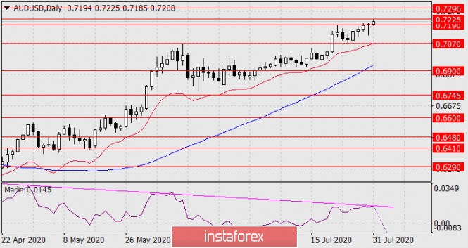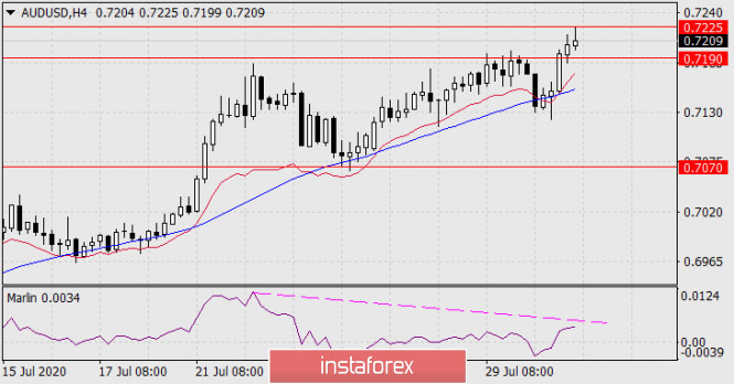 Прогноз по AUD/USD на 31 июля 2020 годаИнстаФорекс - Instaforex, 5 лет назад AUD/USD Сегодня утром цена борется в верхней границей целевого диапазона 0.7190-0.7225, успех чего приведёт к росту до 0.7296 (вершина января 2019 года). Тройная дивергенция по осциллятору Марлин при этом сохранится. Как итог, мы ждём разворот австралийского доллара либо от текущих уровней, либо от 0.7296.