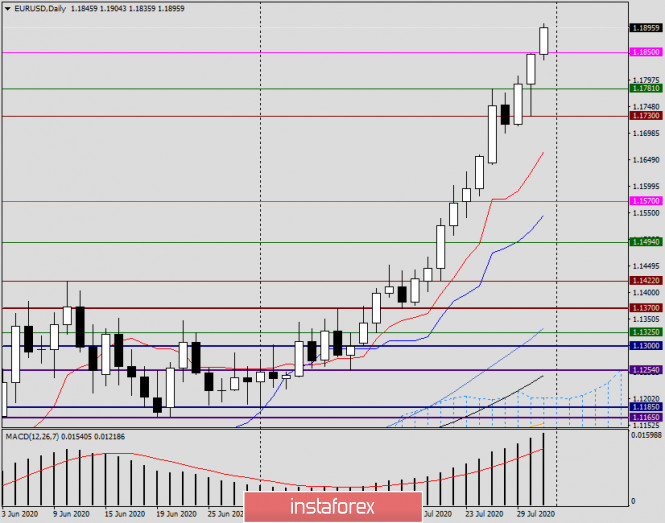 Анализ и прогноз по EUR/USD на 31 июля 2020 годаИнстаФорекс - Instaforex, 5 лет назад Рынок упорно движется вверх не замечая никаких преград Здравствуйте, уважаемые коллеги! На вчерашних торгах главная валютная пара рынка Forex продолжила демонстрировать восходящую направленность. На этот раз к бычьему сценарию сессии 30 июля можно приписать сокрушительное падение ВВП США во втором квартале. Всему виной злосчастная пандемия COVID-19, основной очаг которой разгорелся именно в Соединённых Штатах Америки. Так что прав был глава ФРС Джером Пауэлл, который на своей последней пресс-конференции в эту среду приписывал все трудности восстановления экономики США влиянию коронавируса. Оказалось, это были не приписки и даже не очковтирательство. Пандемия COVID-19 действительно нанесла серьёзнейший урон ведущей мировой экономике во втором квартале. Тем не менее реальные цифры падения американского ВВП оказались лучше прогнозов экономистов, которые сводились к минус 34.1%. На самом деле ведущая мировая экономика рухнула во втором квартале всего лишь на 32.9%. С того момента как начала вестись статистика, это самое высокое падение ВВП за всю историю США. Если закончить с темой ВВП, то цифры могли быть ещё хуже, если бы не масштабная программа стимулирования, объём которой составляет около трёх миллиардов долларов. Впрочем, здесь необходимо отметить, что это данные за апрель-июнь, то есть за те месяцы, когда эпидемия особо свирепствовала. Хотя, всё относительно. После нескольких дней стабилизации и некоторого снижения суточного прироста инфицированных и умерших очаг пандемии снова разгорелся в Техасе, Калифорнии и во Флориде. Результат печальный и трагичный. На вчерашний вечер суточное число заражённых в Соединённых Штатах вновь превысило 70 000 человек, а количество смертей составило 1500. Daily Несмотря на то что итоговые данные по ВВП США оказались лучше прогнозного значения, это не уберегло американскую валюту от ещё одного витка снижения. В результате вчерашнего роста валютная пара EUR/USD завершила торги на 1.1846, что гораздо выше значимого технического уровня 1.1800, а также ещё одной крепкой отметки 1.1830. Котировка продолжает активное движение в северном направлении, и, как представляется, на данный момент, такой динамике вряд ли что-то может помешать. Восходящий тренд по евро/доллару силён. Теперь относительно сегодняшних перспектив ценового движения. Напомню, что сегодня так называемое «тройное закрытие» - день, неделя, месяц. По моему мнению, это далеко не лучший момент для открытия новых позиций. Пара может либо продолжить рост и завершить июльские и недельные торги на мажорной ноте. Другим вариантом может стать коррекционный откат, который произойдёт на фоне фиксации прибыли. Н4 Как хорошо видно на четырёхчасовом графике, сегодня подъём котировки продолжается и уже была проверенна на прочность ещё одна довольно-таки важная отметка 1.1900, которая пока устояла и стала виновницей незначительного отката цены. Практически нет сомнений в том, что евробыки попробуют сегодня ещё раз протестировать на пробой этот значимый уровень. Закрытие месяца, недели и дня выше 1.1900 лишь подчеркнет силу бычьих настроений по главной валютной паре и откроет дорогу к знаковому психологическому уровню 1.2000. В случае прохождения вверх этой отметки следующее серьёзное сопротивление про